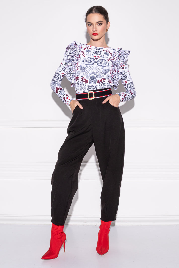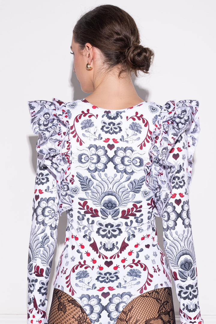Elől zárt, hátán mély és íves nyakkivágású, alak követő, hosszú ujjú body, melynek nyakkörét félbehajtott pánt szegi. Vállait két-két széles, húzott fodor díszíti. Alul gumizott combrésszel, ülepén állítható kapoccsal záródik. A fazonra kicsi, SUGARBIRD feliratú címkét varrtunk.