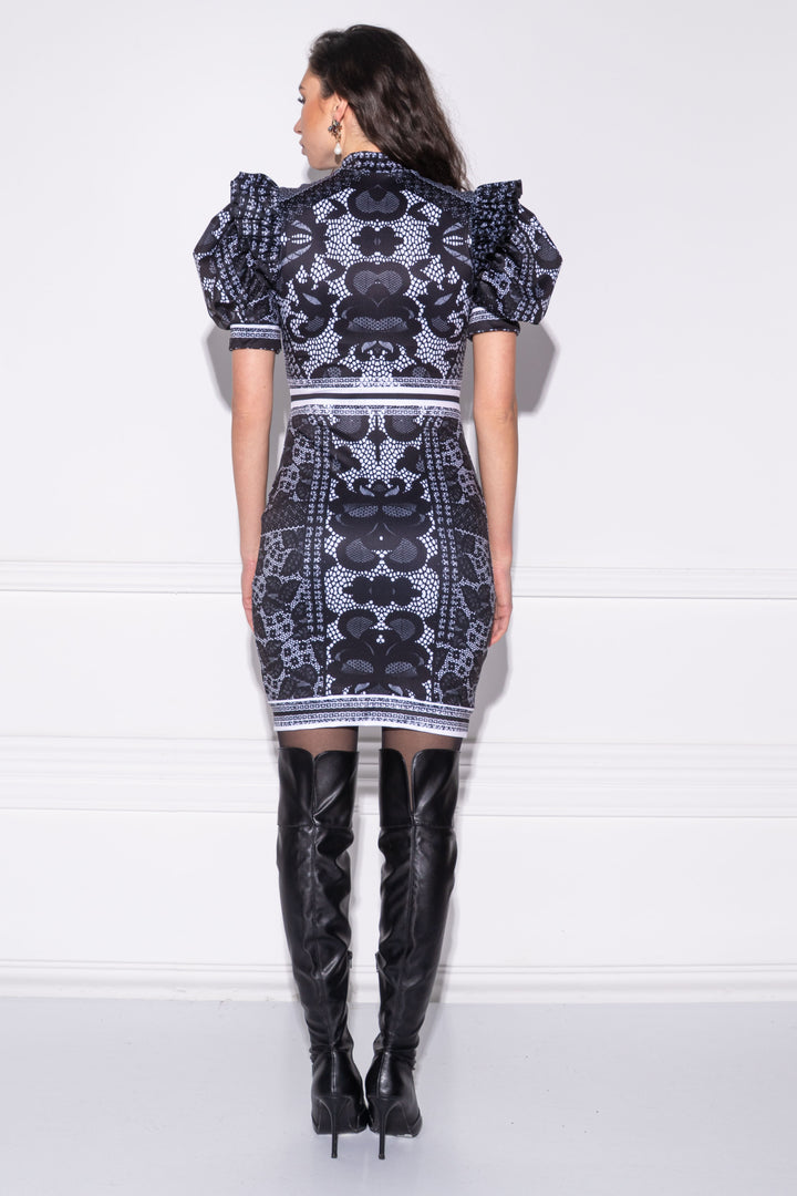 A figure-hugging dress with short puff sleeves and above-the-knee length. The neckline, hem and bottom of the sleeves are edged with a wide strap. The shoulders are decorated with ruffles drawn on both sides and bows made of black ribbon. On the sleeves SUGARBIRD We sewed a label with the inscription.