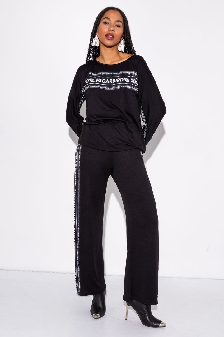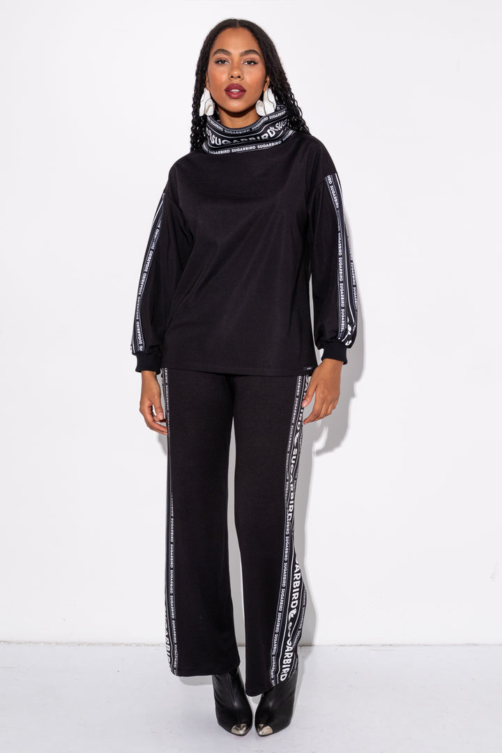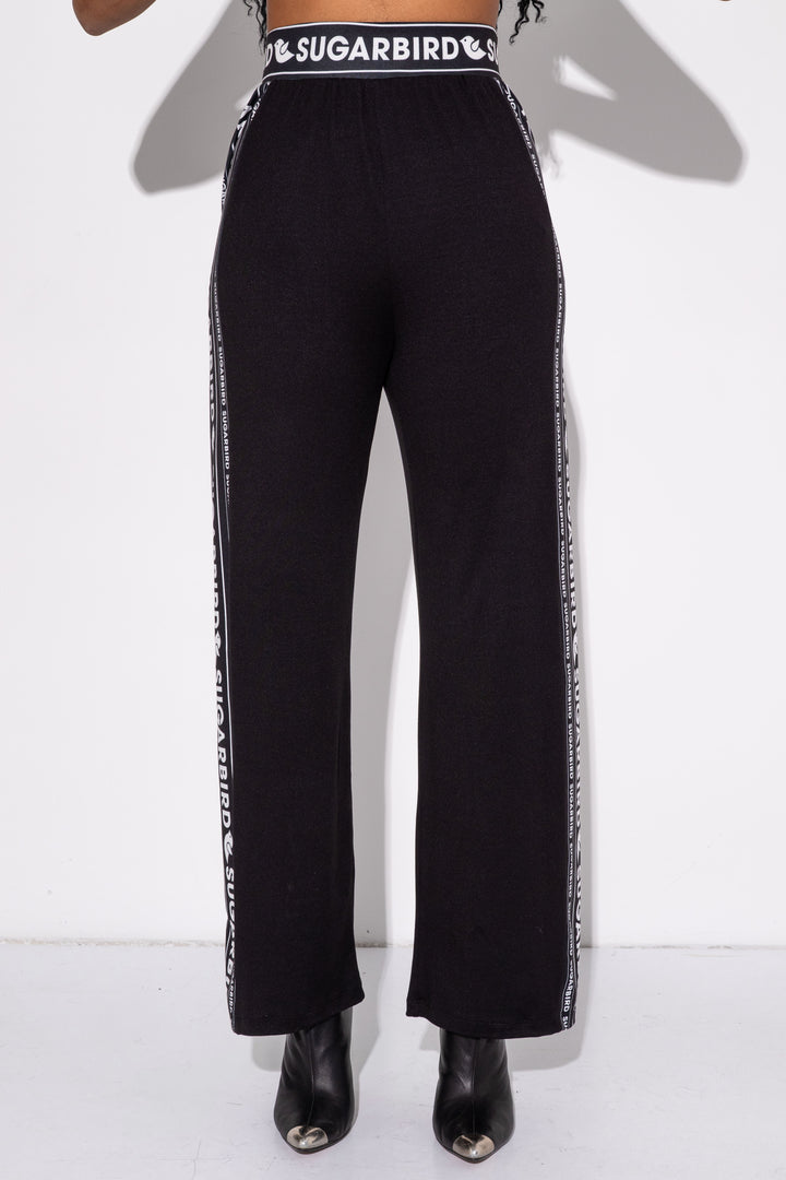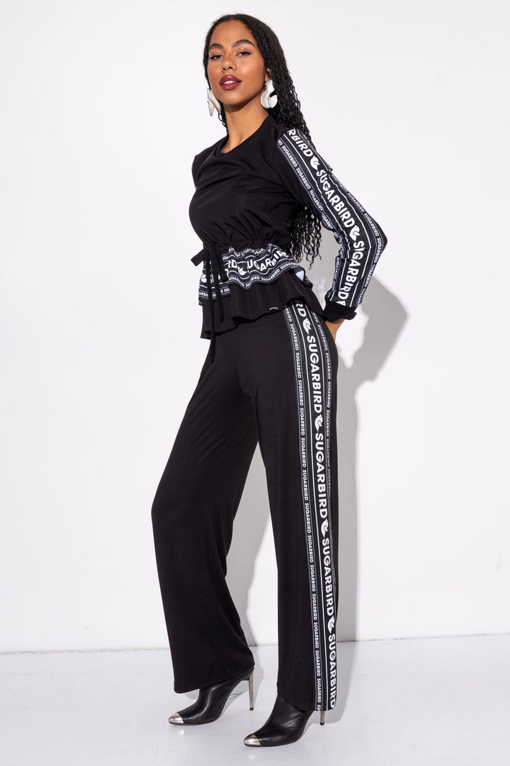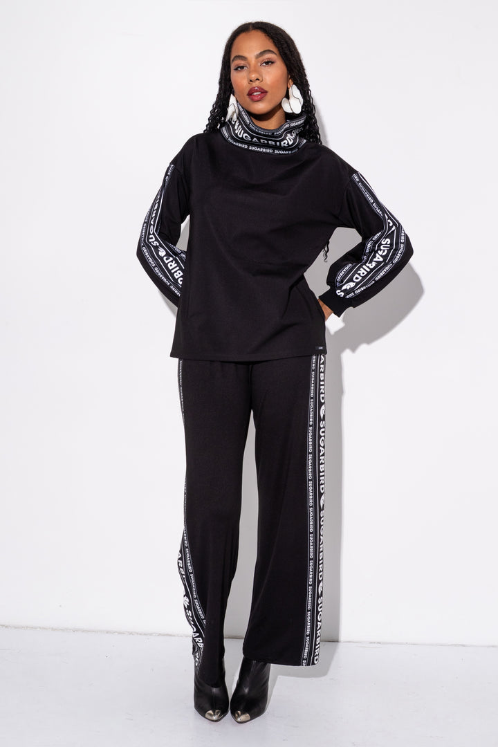 Long, straight-leg, high-waisted trousers. The waist is cinched with a folded waistband that is elasticated. The sides are decorated with a specially tailored, printed insert.
