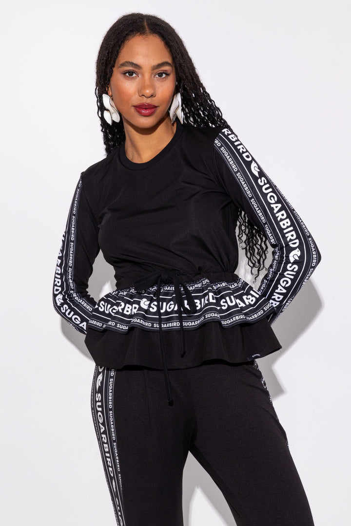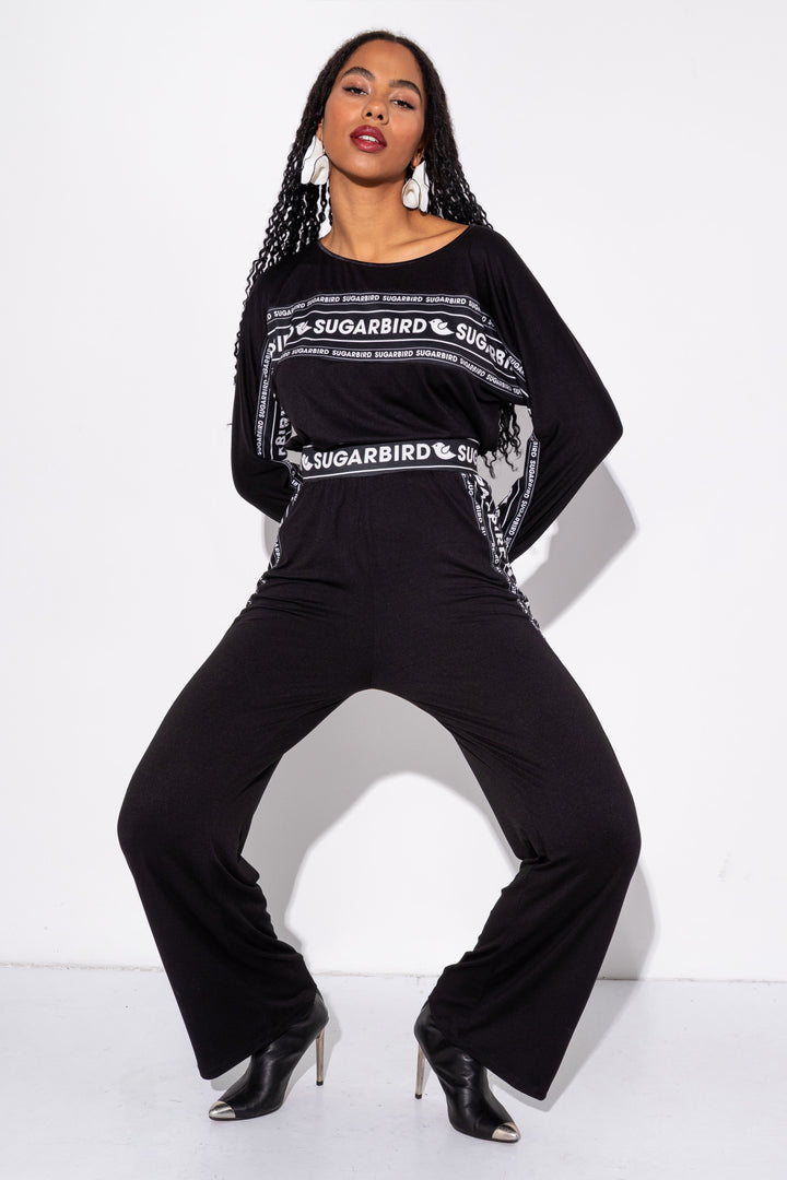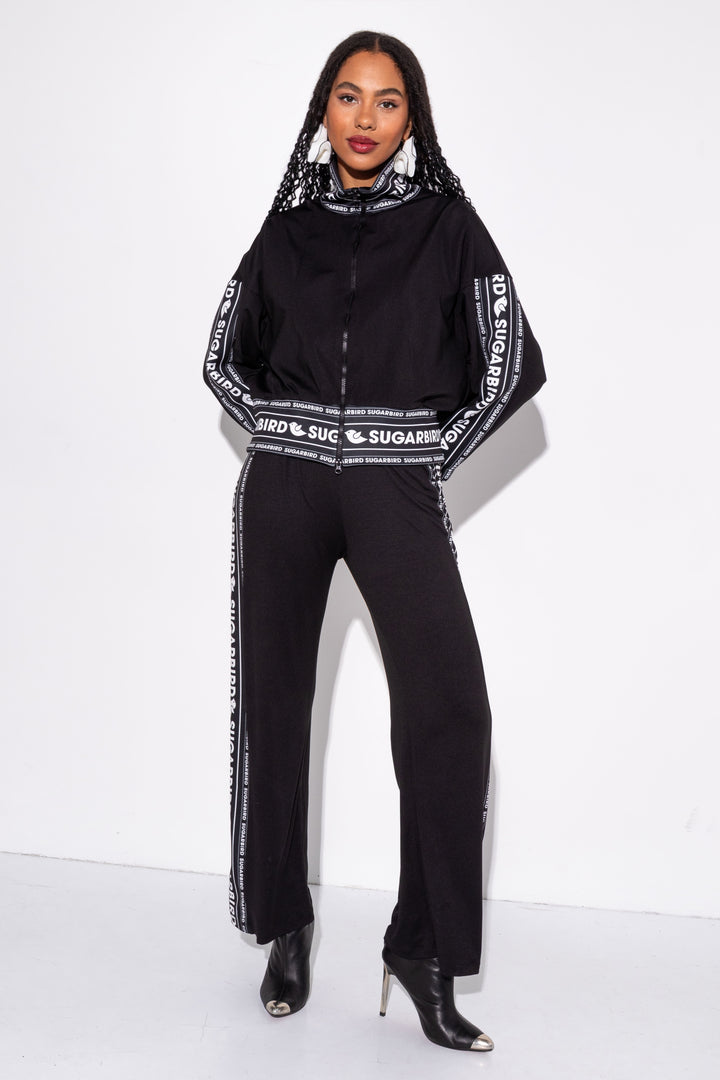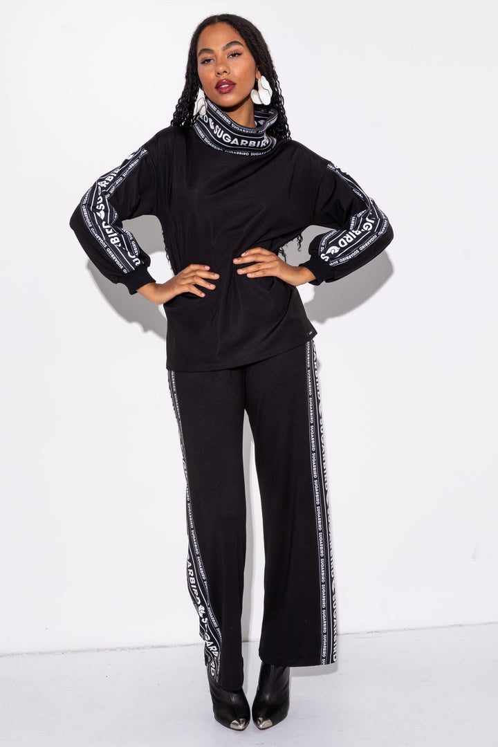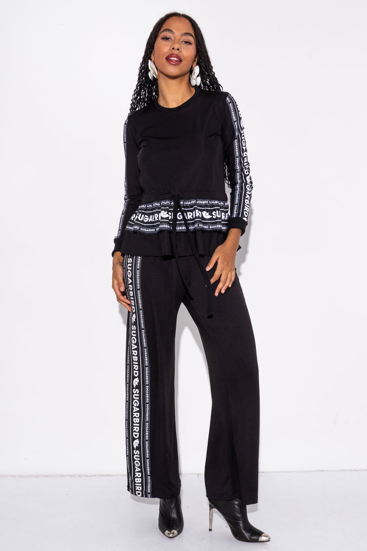 Long, straight-leg, high-waisted trousers. The waist is cinched with a folded waistband that is elasticated. The sides are decorated with a specially tailored, printed insert.