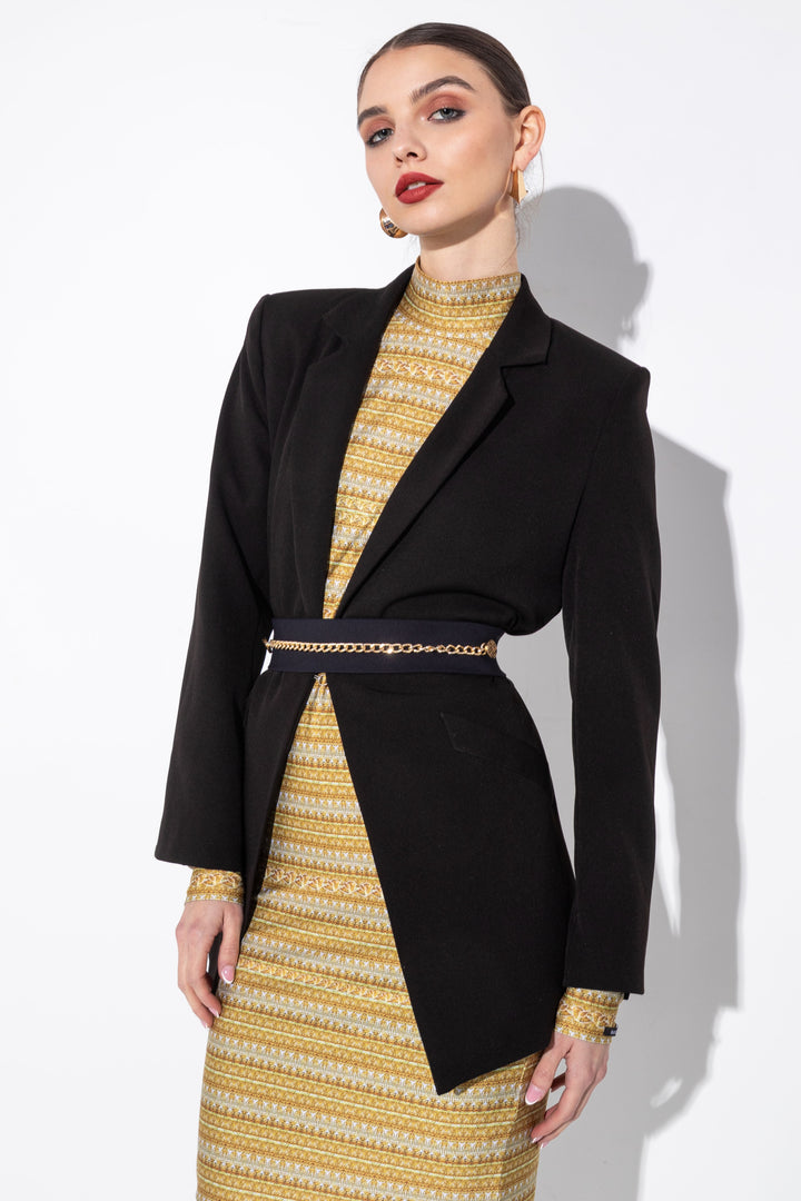 Térd alatti hosszúságú, hosszú ujjú, alak követő ruha. Nyakát széles pánt szegi, ujjára SUGARBIRD feliratú címkét varrtunk. A ruhához egy különálló, arany színű gombokkal és lánccal díszített, gumis öv is készült, amely fém övcsattal záródik.