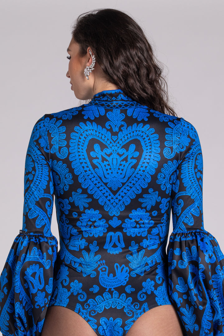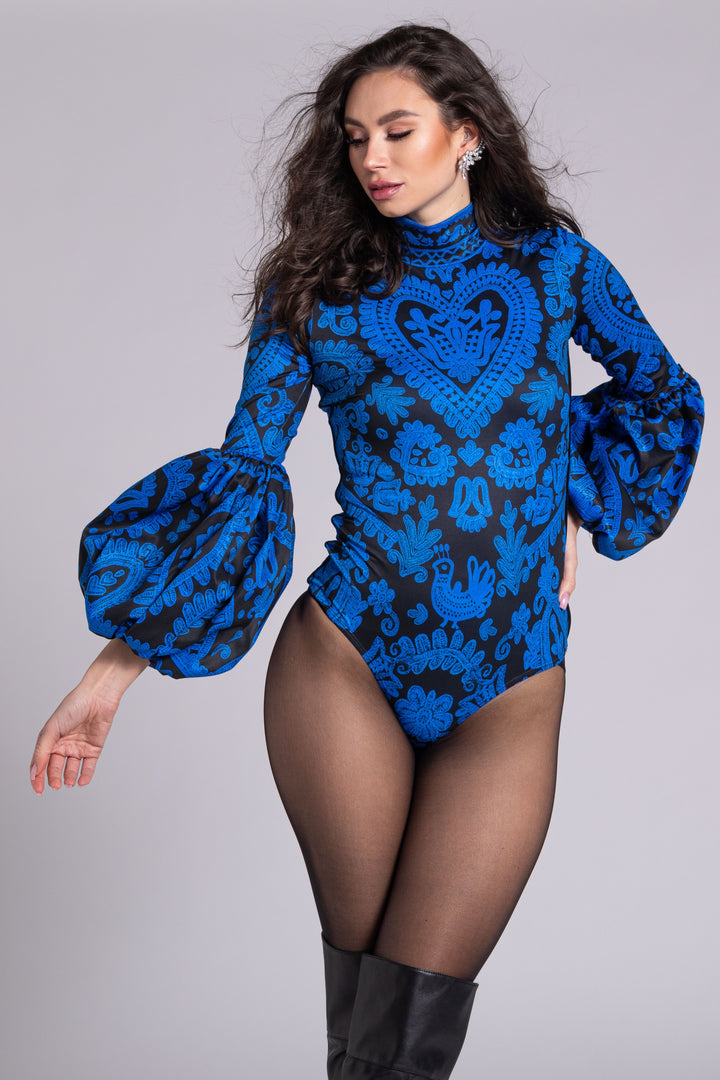 Long and puffy sleeve, form-fitting bodysuit. Neckline with turtleneck, cuffed sleeves, elasticated bottom. Elasticated bottom with elasticated thigh and adjustable snap closure. Sleeves SUGARBIRD We sewed a label with the inscription.