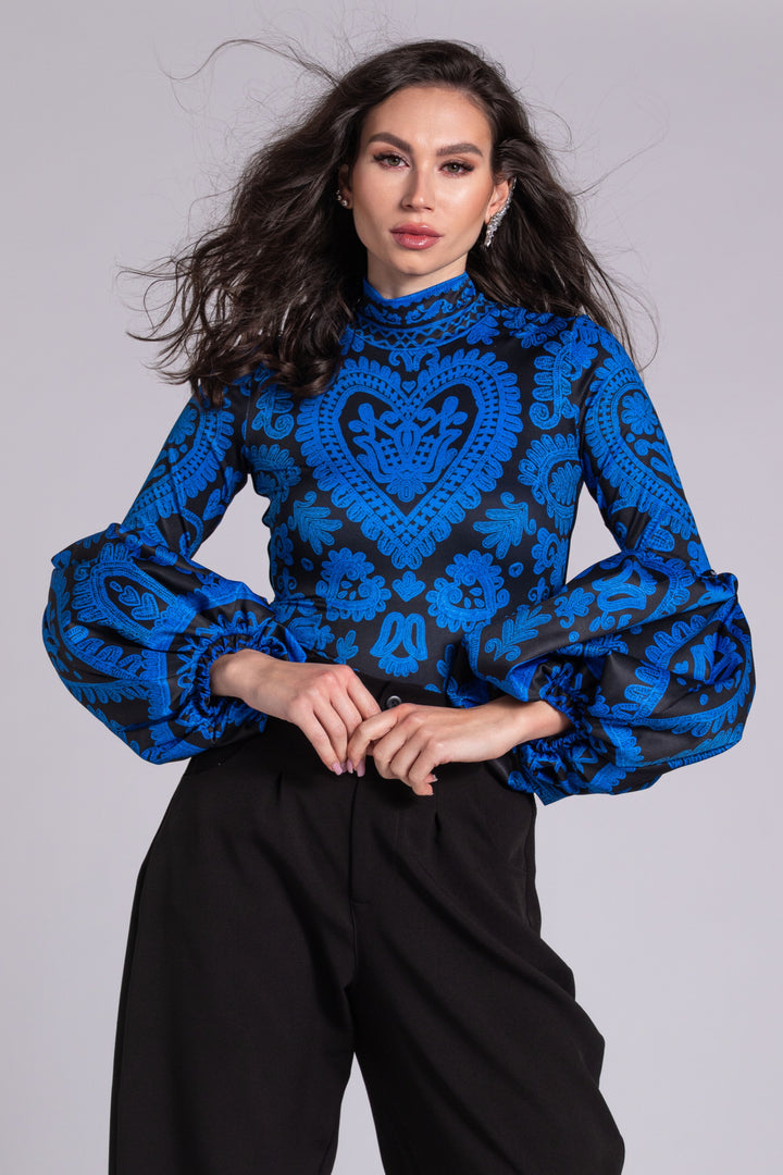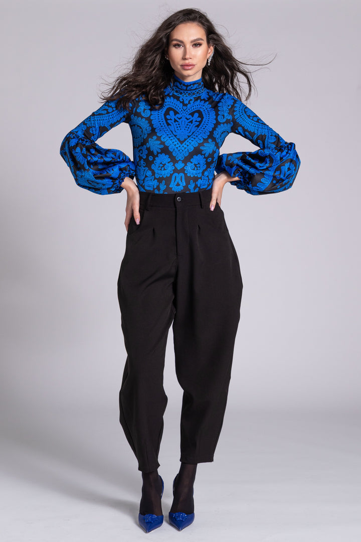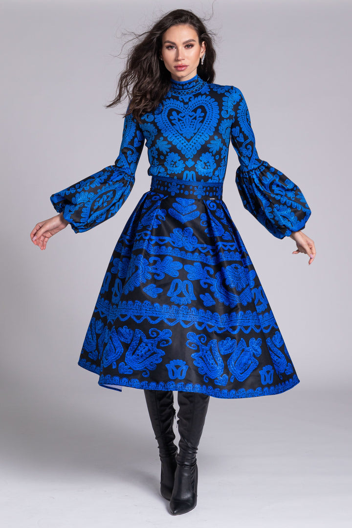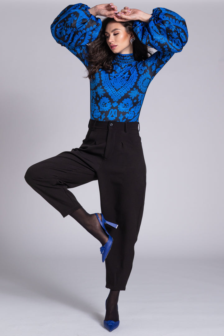 The pattern of our collection is decorated with graphics printed in blue on a black background, based on the Kalotaszeg written embroidery found in Transylvania.