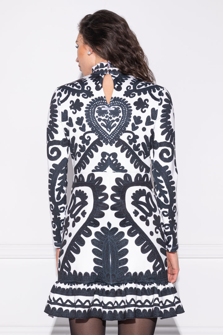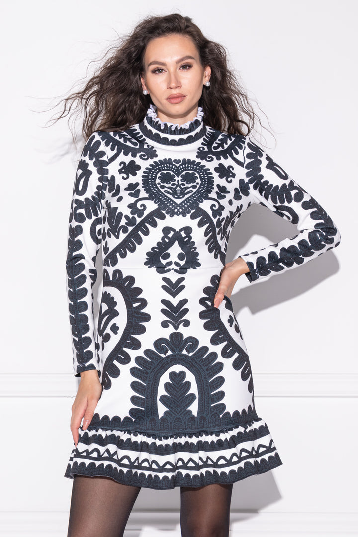 Long-sleeved, mid-thigh-length, form-fitting dress. The neck is trimmed with a stand-up collar, which closes with buttons above a slit on the back. It is decorated with a narrow ruffle on the collar and a wide ruffle at the bottom. On the back SUGARBIRD We sewed a label with the inscription.
