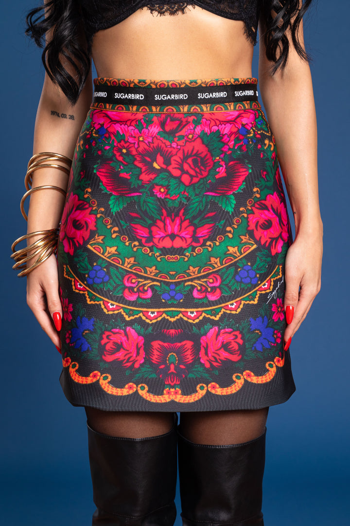 Mid-thigh, lined, form-fitting miniskirt. The waist is hemmed with a folded strap. It opens with a zipper in the middle of the back.