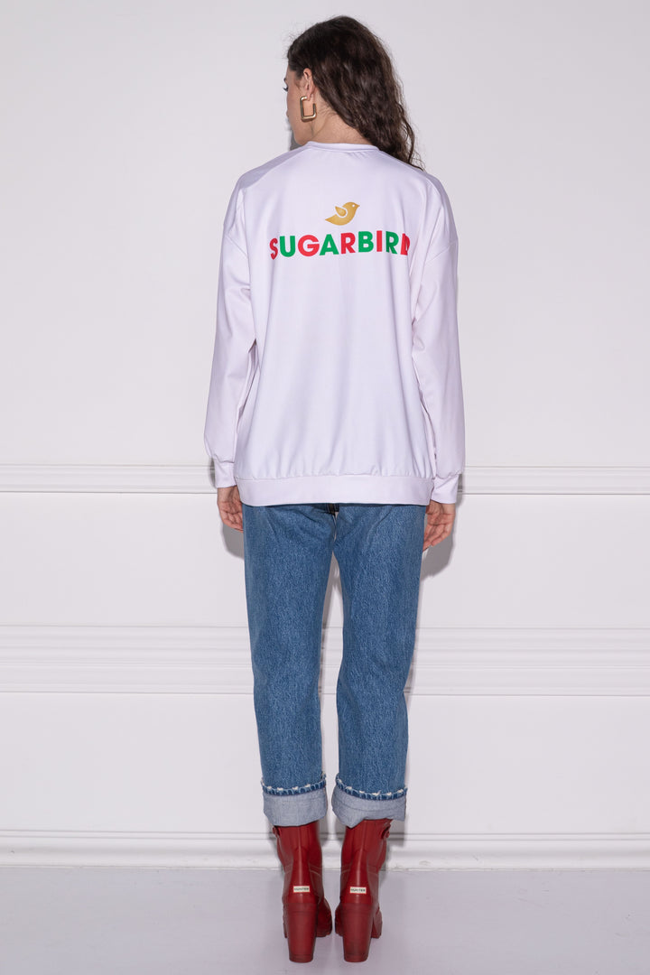 Long-sleeved, hip-length, loose-fitting sweater. Closed round neck, hem and cuffs are edged with folded straps. Front SUGARBIRD We sewed a label with the inscription.