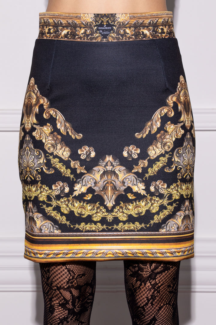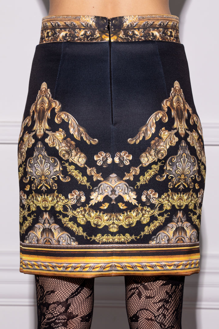 Mid-thigh-length, form-fitting, lined skirt. Zip fastening in the middle of the back. Wide, folded-over waistband.