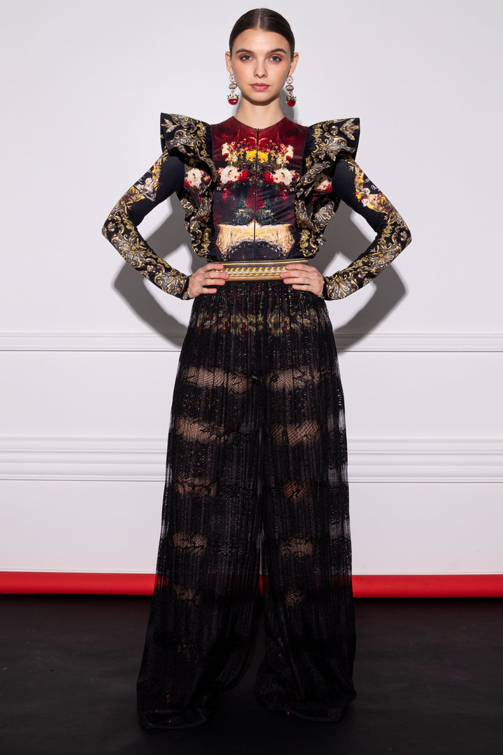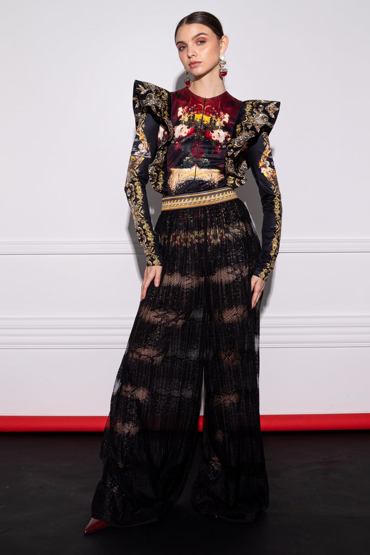 Long, loose-fitting, high-waisted lace trousers with a folded waistband and elasticated waist.
