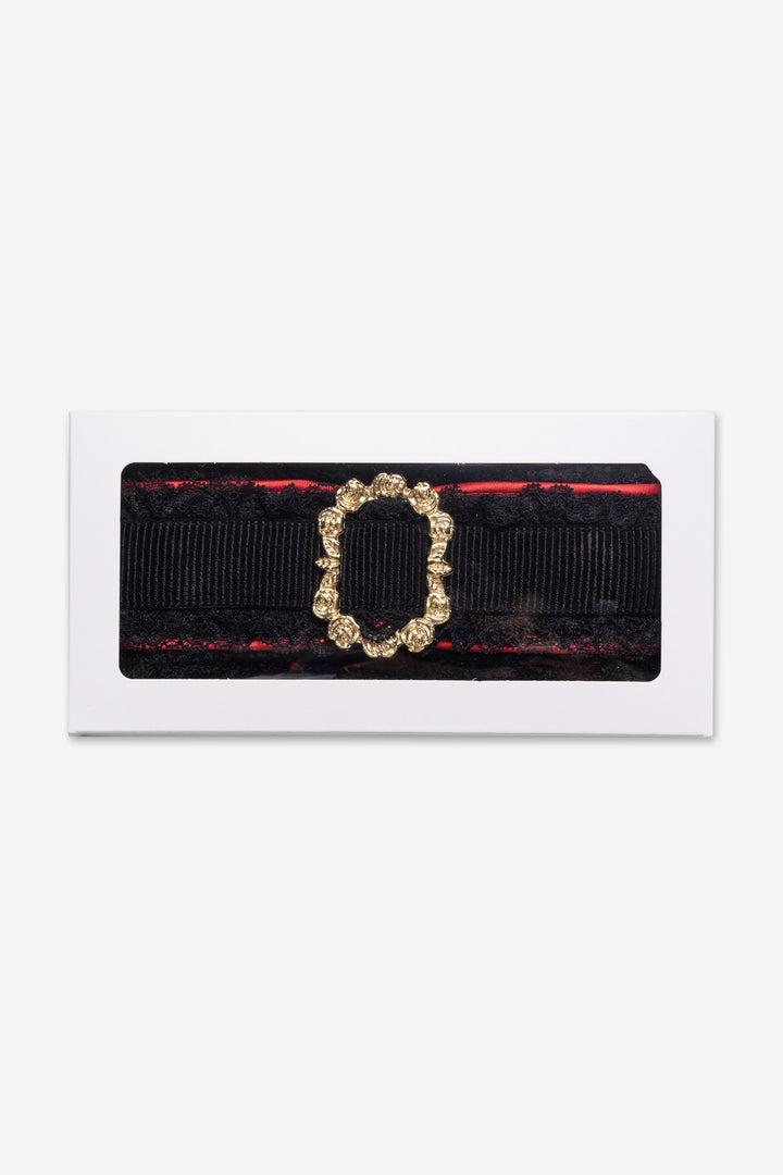 Széles gumis öv, amely fém övcsattal záródik. Szélein csipke kellék és paszpól, elején díszes fém kellék, a csat mellett piros színű, SUGARBIRD feliratú címke díszíti. A termék stílusosan kialakított, díszdobozos csomagolásban érkezik, mely nemcsak esztétikus, hanem ízléses is.