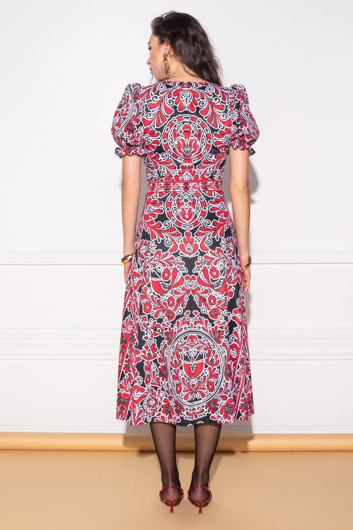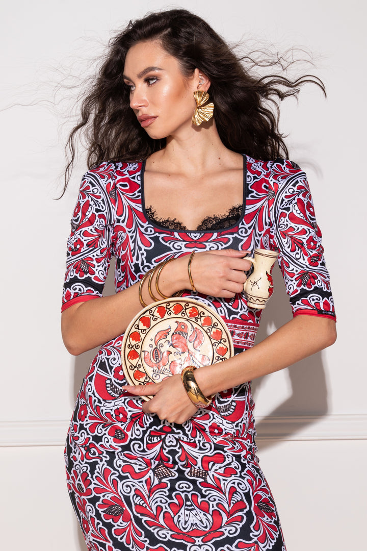 Maxi length, three-quarter length, puffed sleeves, form-fitting dress. The neck is arched and edged with a narrow strap. The bottom is edged with a wide, drawn ruffle. On the sleeves