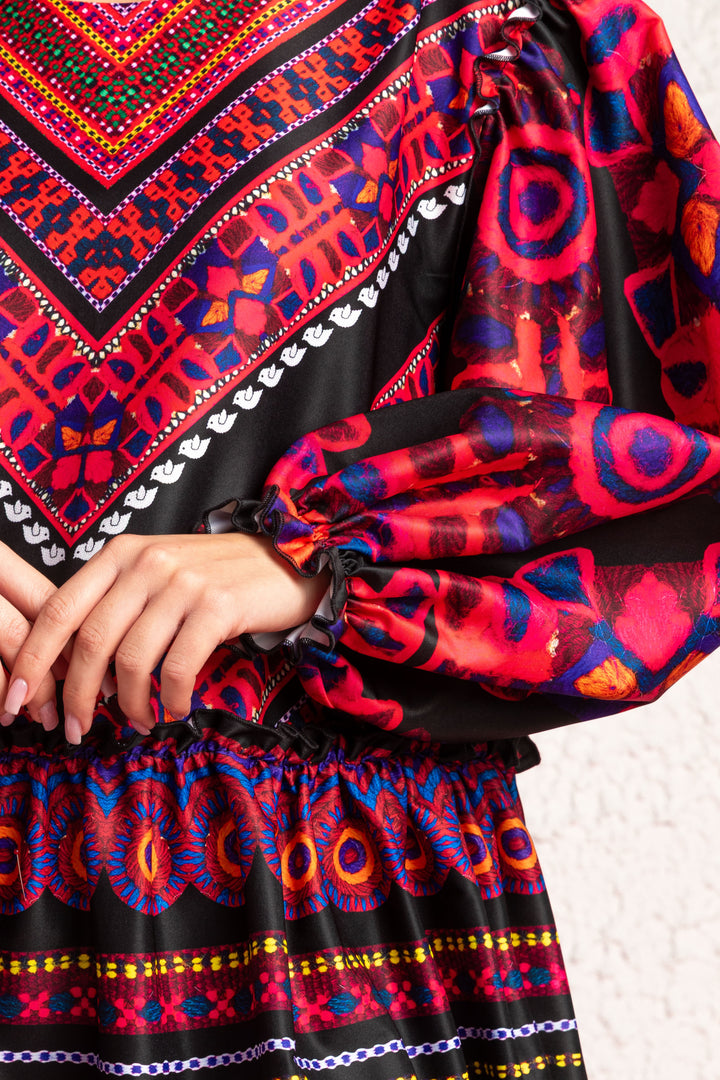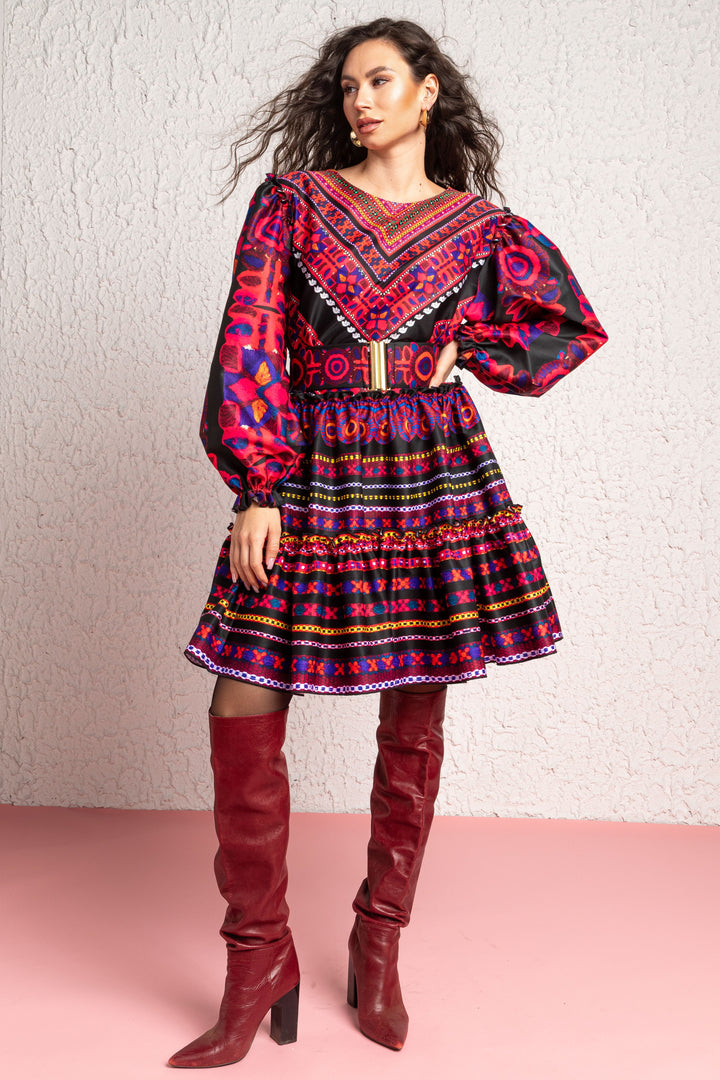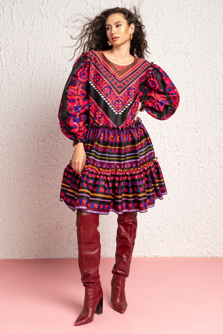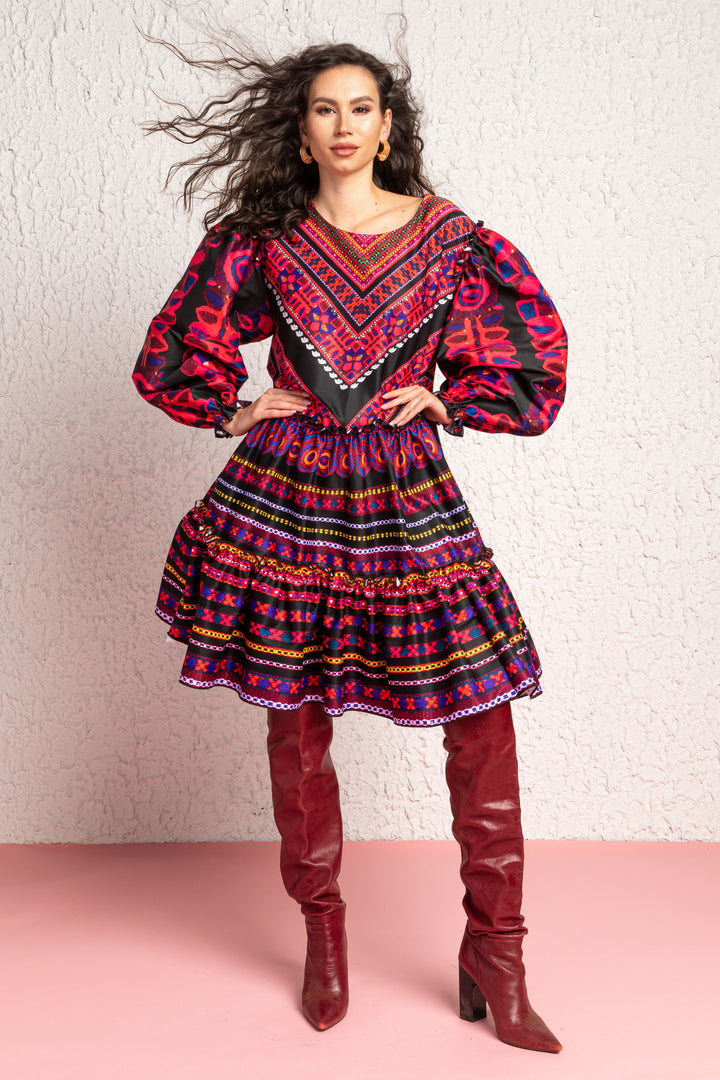 Discover new Csángó The special pieces of our collection, which feature prints of the woven pattern typical of the region on a black background. Our collection puts the colors and designs of the traditional Transylvanian folk costume in a modern guise.