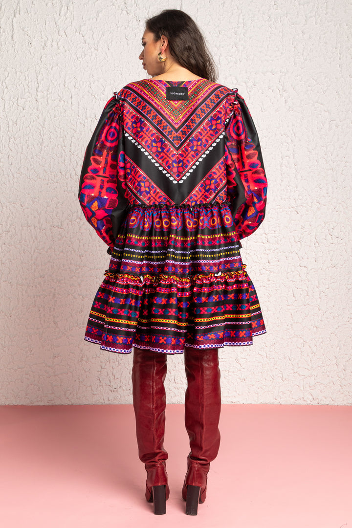 A loose-fitting dress with long sleeves and above-the-knee length. The skirt is made of wide, drawn ruffles, and the bottom of the sleeves is elasticated. The shoulders are decorated with narrow, drawn ruffles. On the back SUGARBIRD We sewed a label with the inscription.