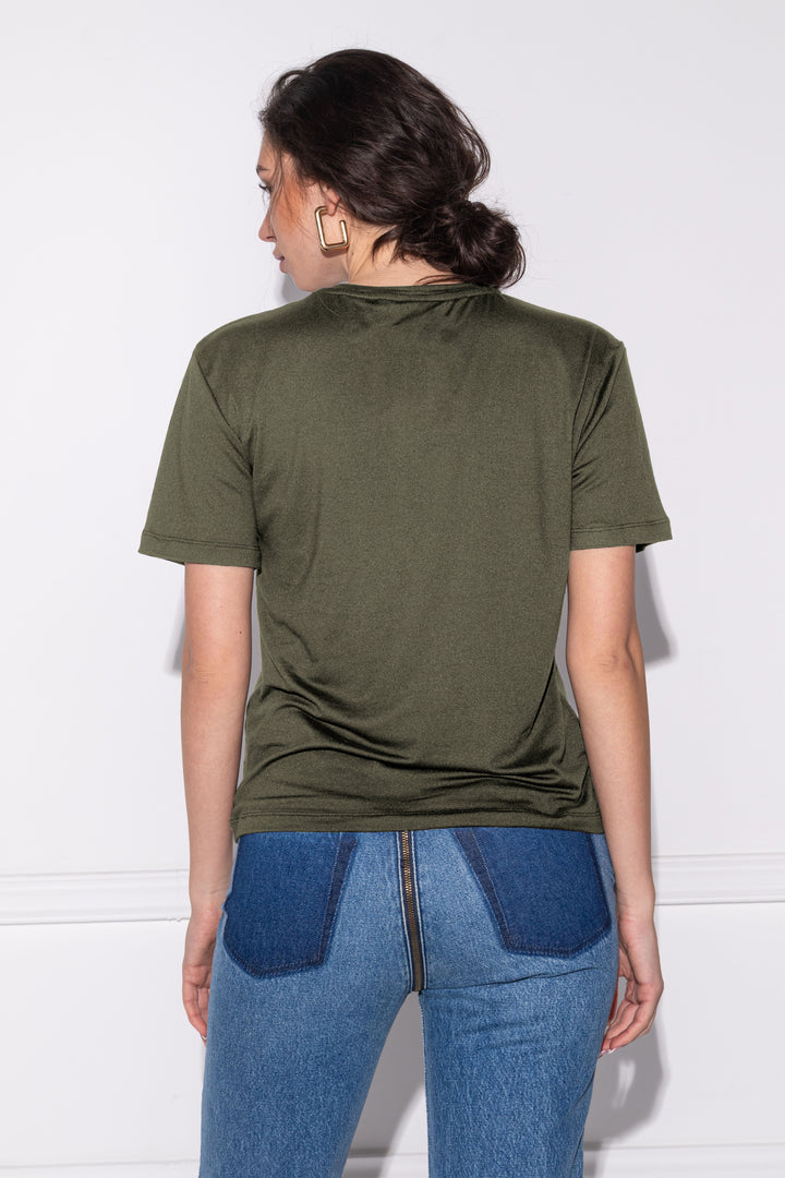 Short-sleeved, hip-length, loose-fitting top. The closed neckline is finished with a tailored, folded-in strap. At the front