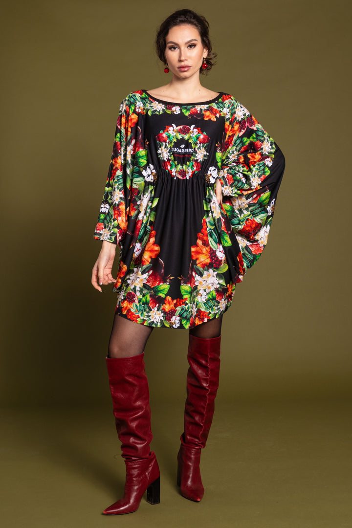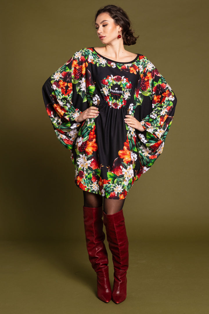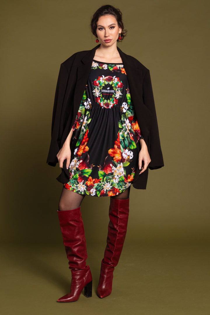 Mid-thigh length, long sleeves, boat neckline, extra loose fit tunic dress. The neckline was edged with a narrow black strap, and the waist was elasticated at the front. On the back SUGARBIRD We sewed a label with the inscription.