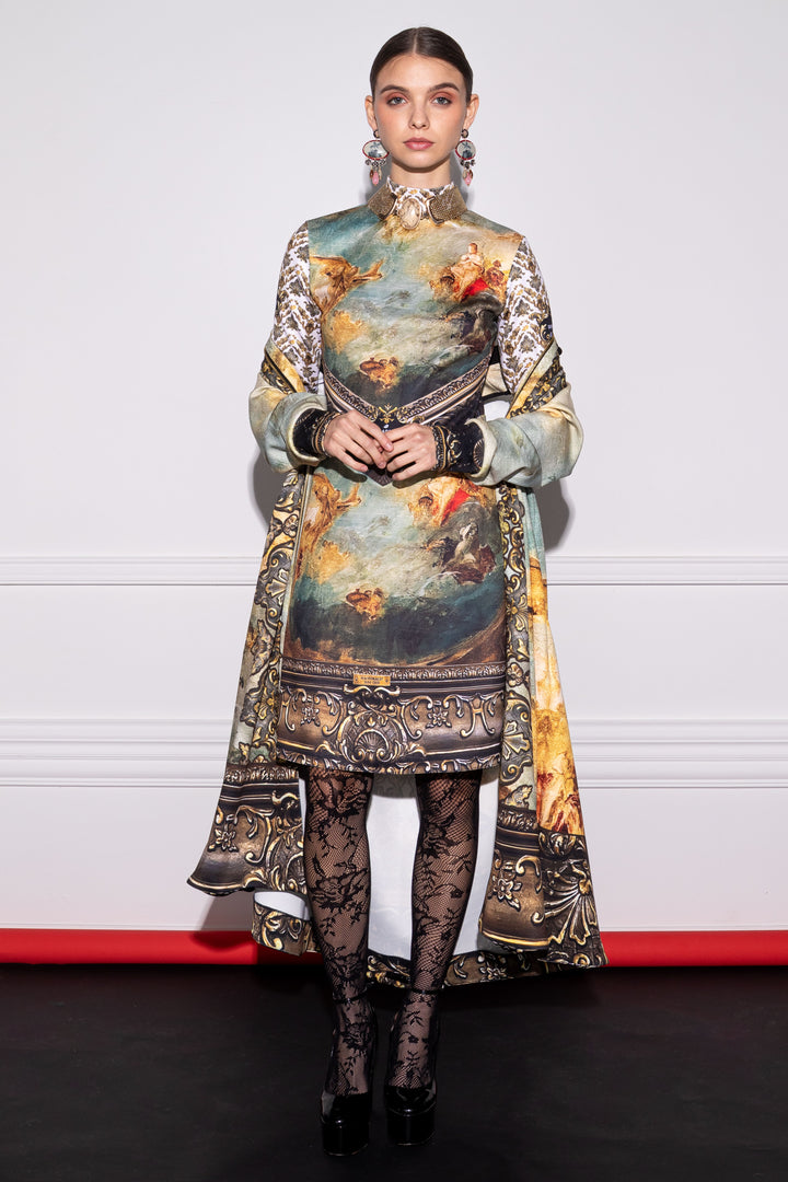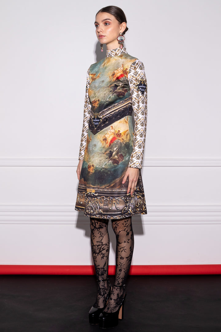 Above-the-knee length, long-sleeved dress. The top is form-fitting, the skirt is slightly flared. The neck is secured with a wide strap and the back opens with a zipper.