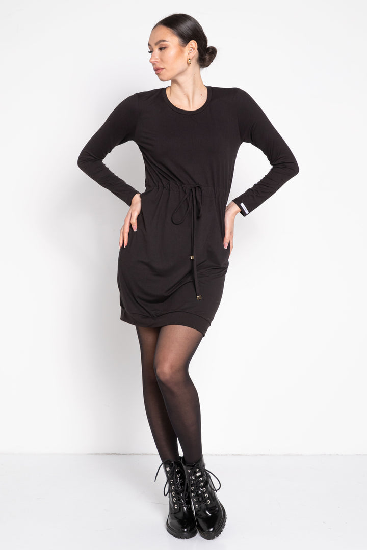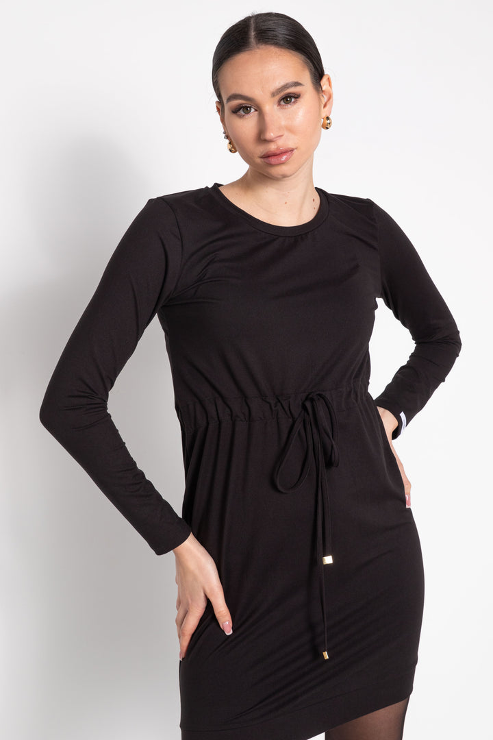 Combközép hosszúságú, hosszú ujjú, alak követő ruha. Kerek kivágású nyakát keskeny, alját széles félbehajtott pánt szegi. Derekán egy keskeny, fém végzáróval ellátott kötő segítségével derékra szűkíthető. Ujján SUGARBIRD feliratú címkével díszítettük.