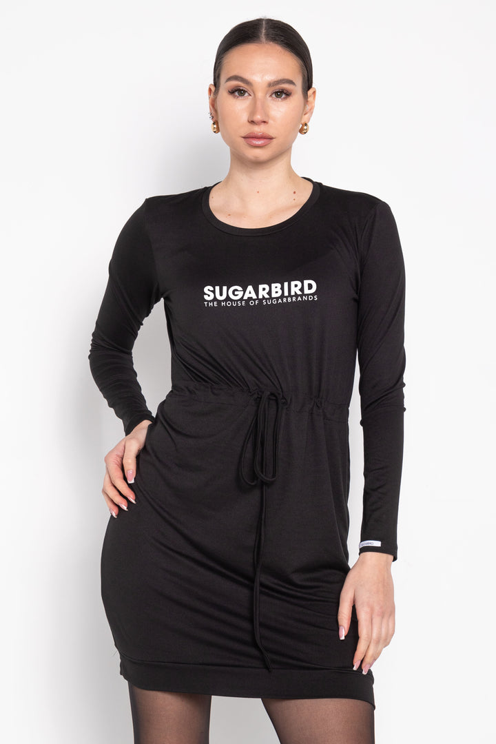 Combközép hosszúságú, hosszú ujjú, alak követő ruha. Kerek kivágású nyakát keskeny, alját széles félbehajtott pánt szegi. Derekán egy keskeny, fém végzáróval ellátott kötő segítségével derékra szűkíthető. Ujján SUGARBIRD feliratú címkével díszítettük.