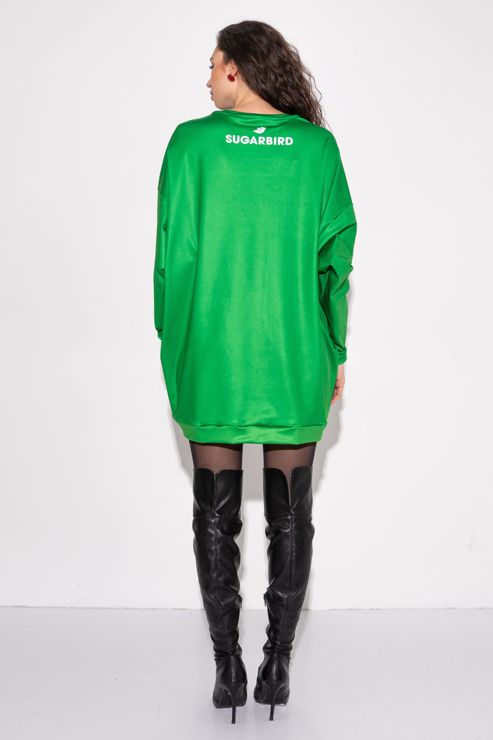 Hosszú ujjú, combközép hosszúságú, bő, oversize fazonú pulóver. Zárt kerek nyakát, alját és ujja alját félbehajtott pántok szegik. Elejére SUGARBIRD feliratú címkét varrtunk.