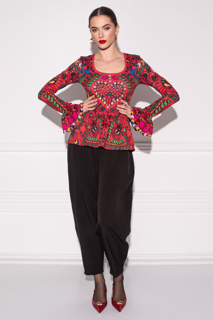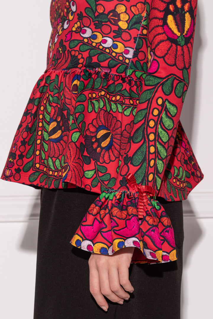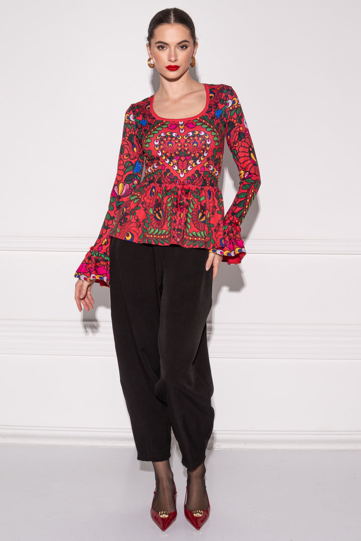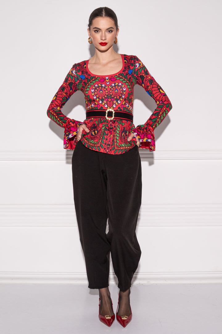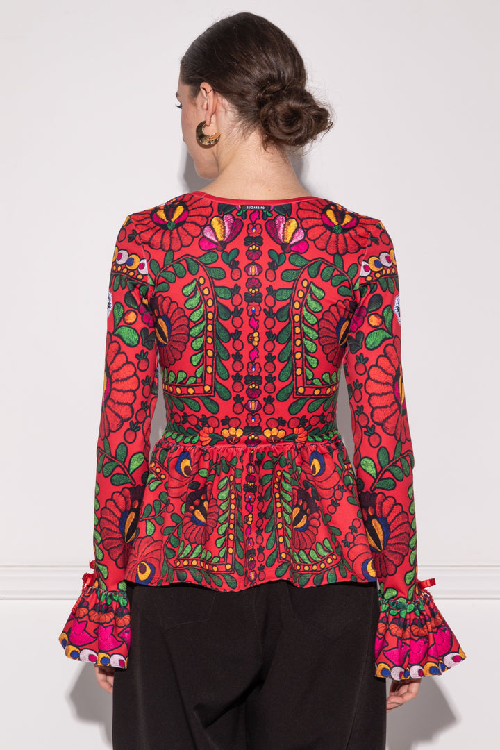 Hip-length, long-sleeved, form-fitting top. Wide neckline edged with a narrow strap. The bottom and bottom of the sleeves are decorated with a wide and drawn ruffle, and the sleeve ruffle is decorated with a bow. On the back