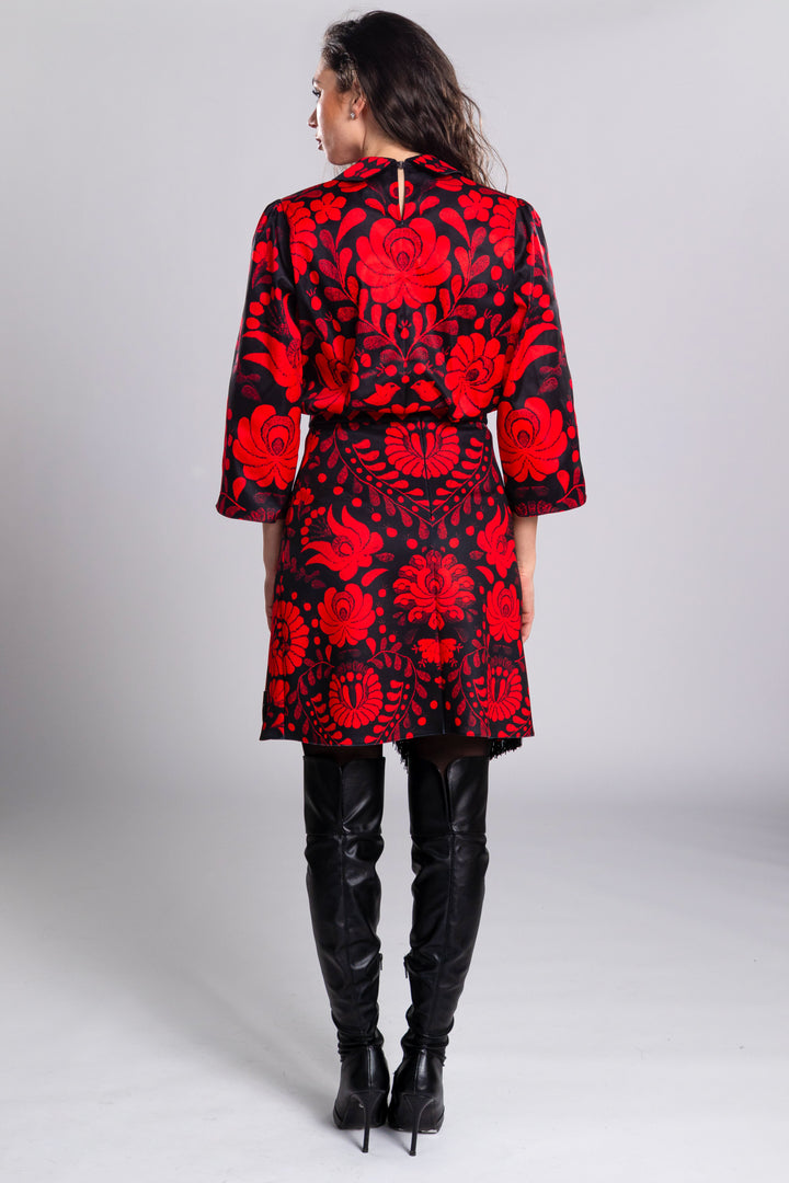 A loose-fitting top with three-quarter sleeves, reaching below the hips. The neck is trimmed with a collar and closes with a hook-and-eye fastener above a slit at the back. To the beginning SUGARBIRD We sewed a label with the words MATYÓ written on it.