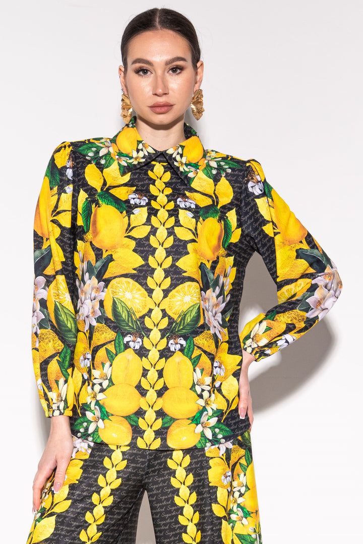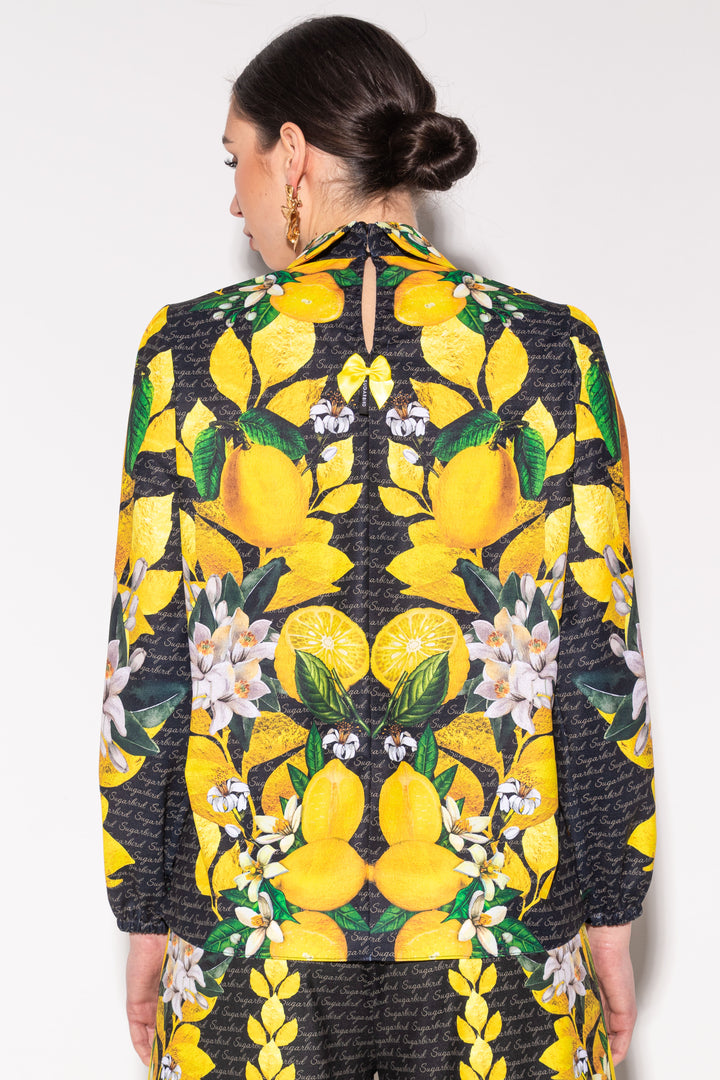 A loose-fitting top that reaches below the hips, with long and rolled sleeves. The neck is trimmed with a tailored collar that closes with buttons above a slit in the middle of the back. A bow detail on the back and
