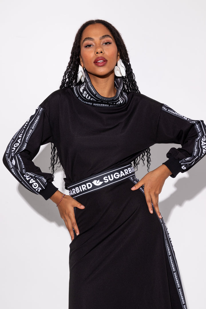 A loose-fitting, long-sleeved top that reaches below the hips. A wide, printed strap ties the neck. Separately tailored, printed inserts on the sleeves, and a front