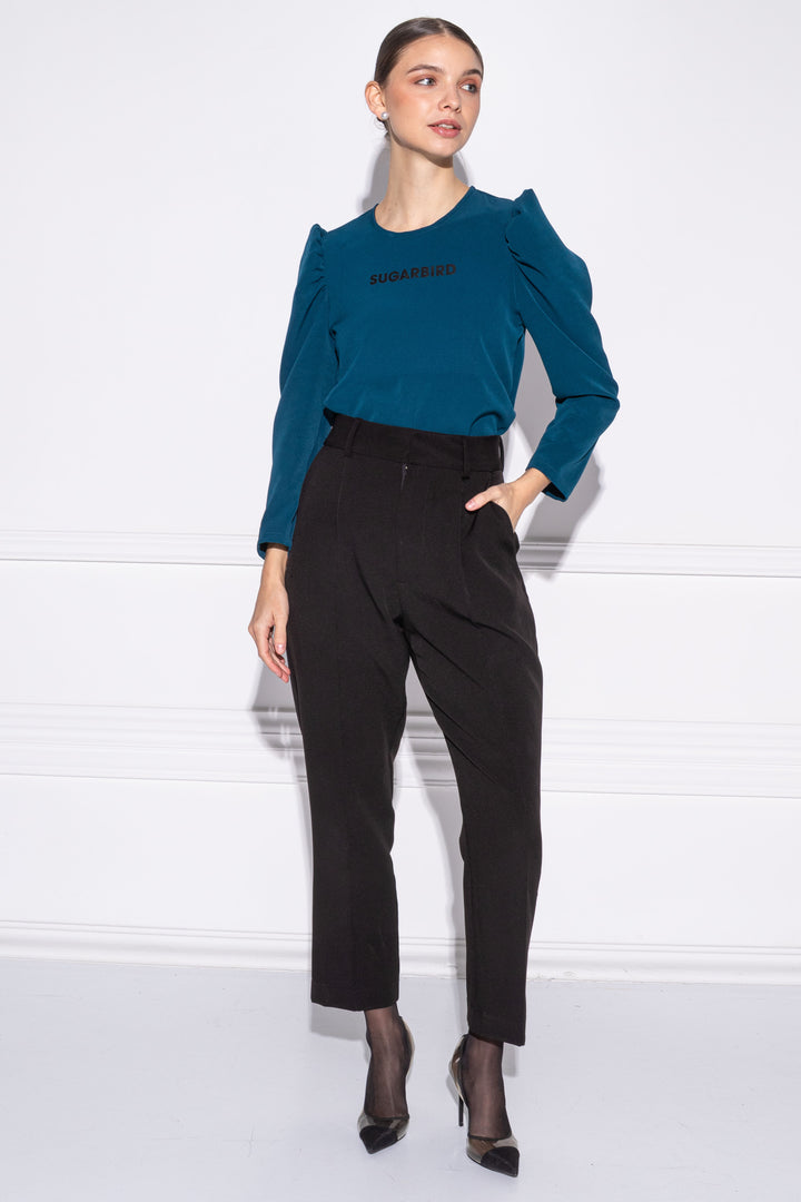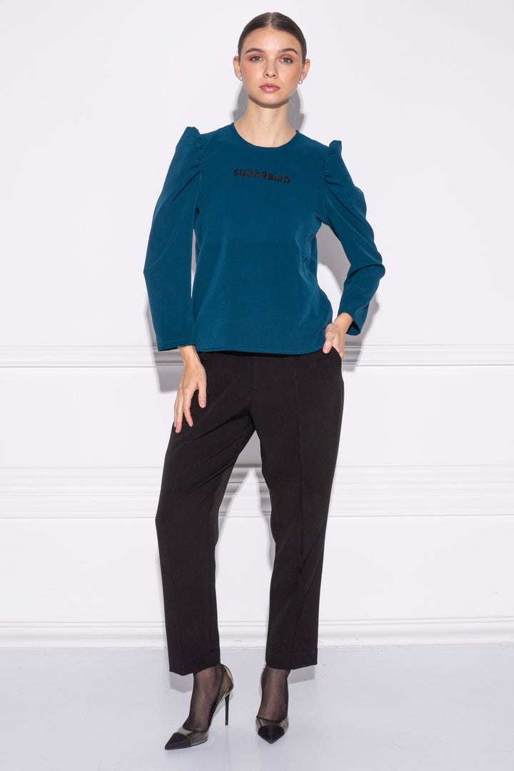 Short, puffy-sleeved shirt that falls above the hips. Closed neckline and fastens with a clasp above a slit at the back.