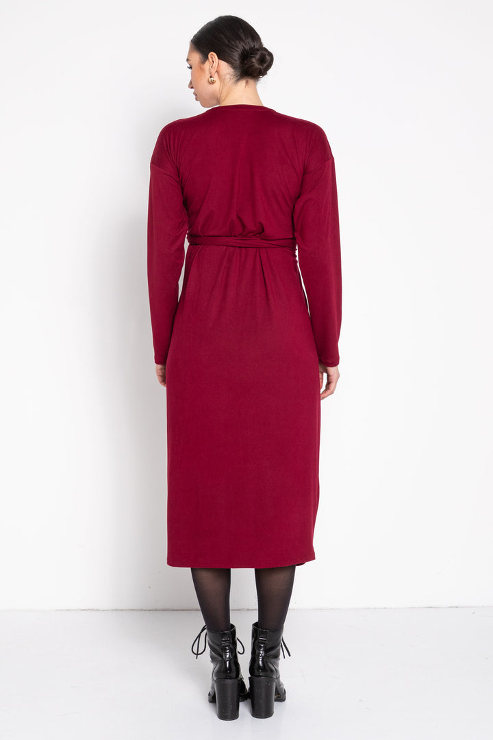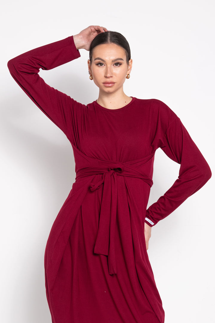 Vádliközép hosszúságú, hosszú ujjú, laza fazonú ruha. Zárt és kerek nyakkivágása keskeny pánttal szegett. Oldalába rögzített hosszú kötőjével a derékon többször átfűzhető. Ujján SUGARBIRD feliratú címkével díszítettük.