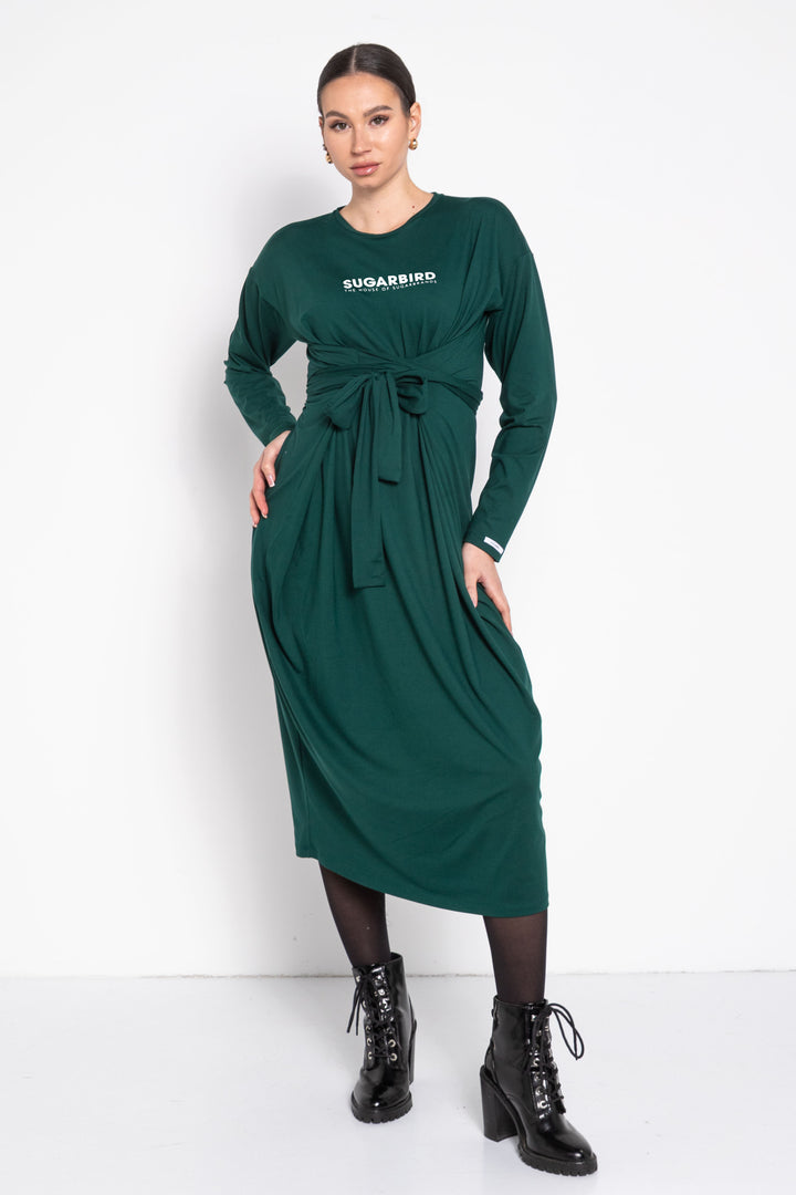Hosszú és bő szárú, hosszú ujjú, lazafazonú overál. Zárt nyakkivágása keskeny pánttal szegett a hátán egy hasíték felett gombbal záródik. Oldalába rögzített hosszú kötőjével a derékon többször átfűzhető. Ujján SUGARBIRD feliratú címkével díszítettük.