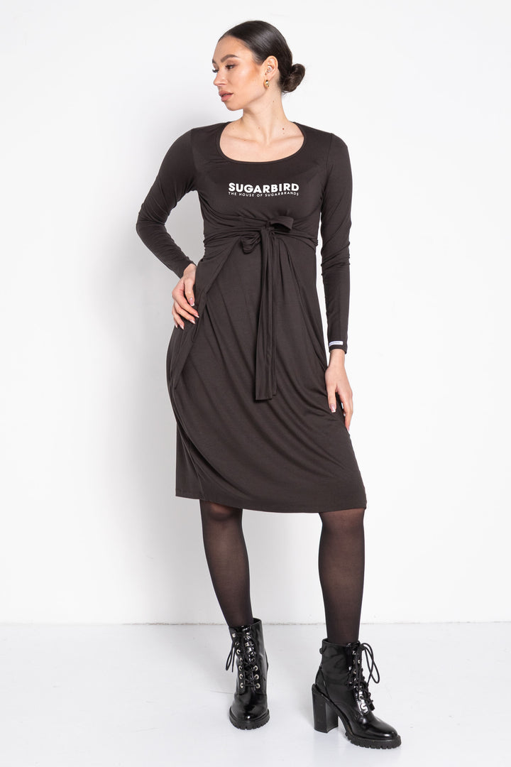 Térd alatti hosszúságú, hosszú ujjú, laza fazonú ruha. Mély és kerek nyakkivágása keskeny pánttal szegett. Oldalába rögzített hosszú kötőjével a derékon többször átfűzhető. Ujján SUGARBIRD feliratú címkével díszítettük.