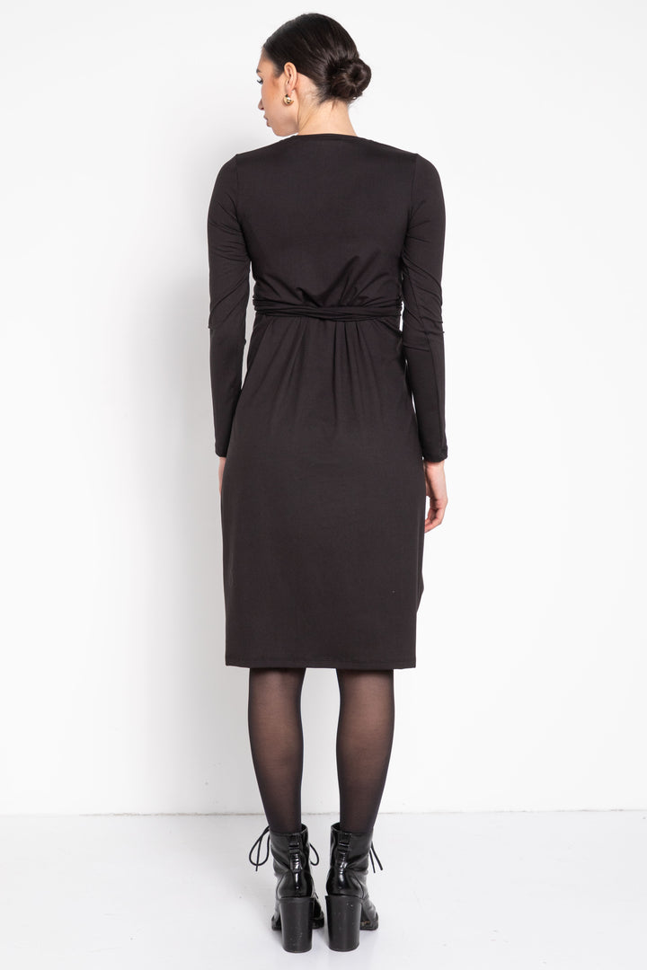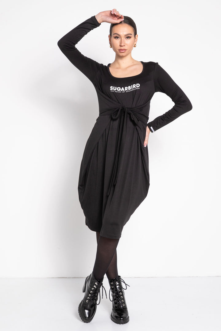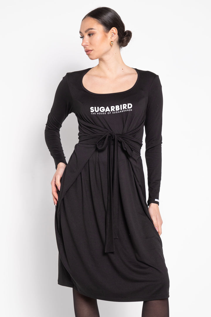 Térd alatti hosszúságú, hosszú ujjú, laza fazonú ruha. Mély és kerek nyakkivágása keskeny pánttal szegett. Oldalába rögzített hosszú kötőjével a derékon többször átfűzhető. Ujján SUGARBIRD feliratú címkével díszítettük.