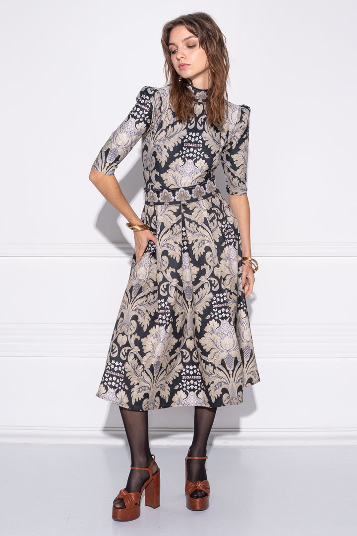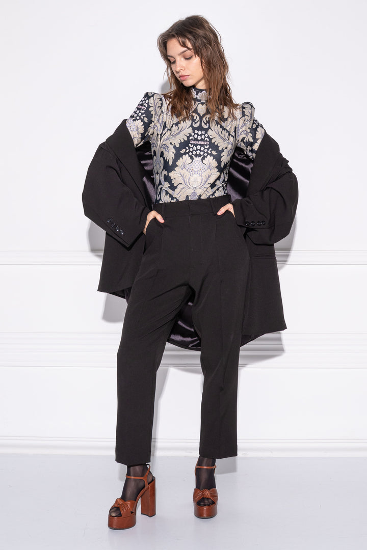 Three-quarter-length, puffed-shoulder, form-fitting bodysuit. The neck is framed by a wide turtleneck-effect strap. It closes with an elasticated thigh section at the bottom and an adjustable clasp at the bottom. On the sleeves