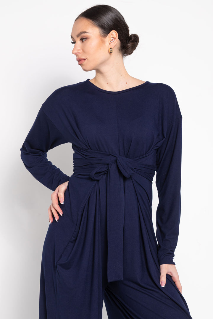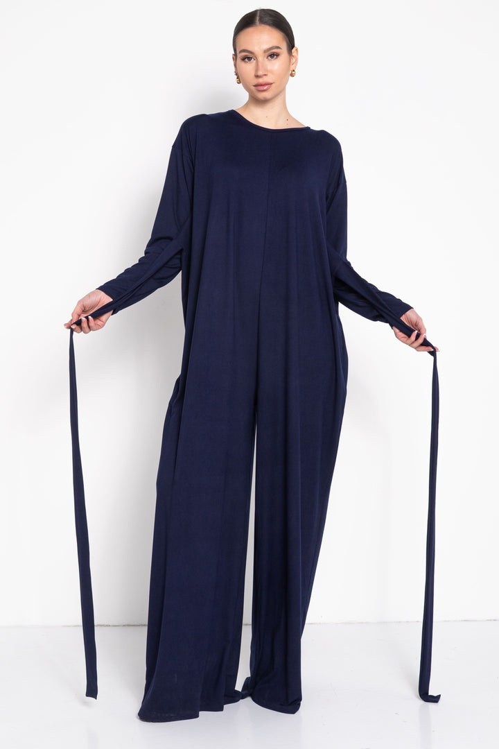 Hosszú és bő szárú, hosszú ujjú, lazafazonú overál. Zárt nyakkivágása keskeny pánttal szegett a hátán egy hasíték felett gombbal záródik. Oldalába rögzített hosszú kötőjével a derékon többször átfűzhető. Ujján SUGARBIRD feliratú címkével díszítettük.