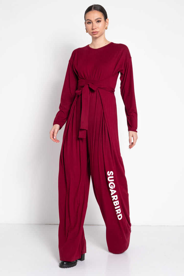 Hosszú és bő szárú, hosszú ujjú, lazafazonú overál. Zárt nyakkivágása keskeny pánttal szegett a hátán egy hasíték felett gombbal záródik. Oldalába rögzített hosszú kötőjével a derékon többször átfűzhető. Ujján SUGARBIRD feliratú címkével díszítettük.