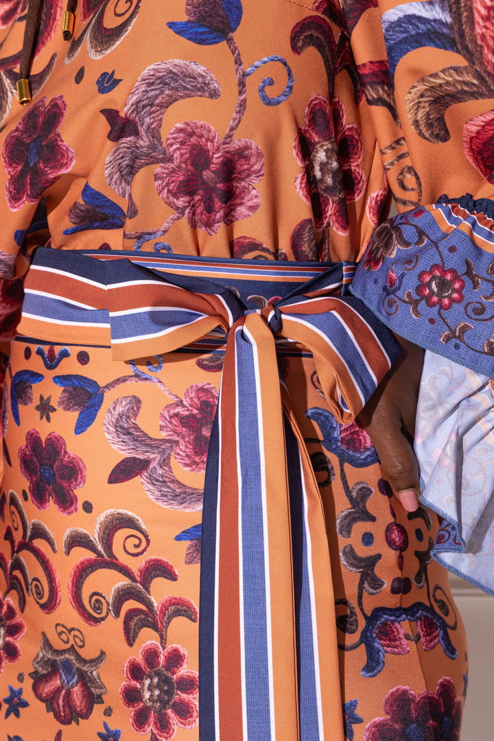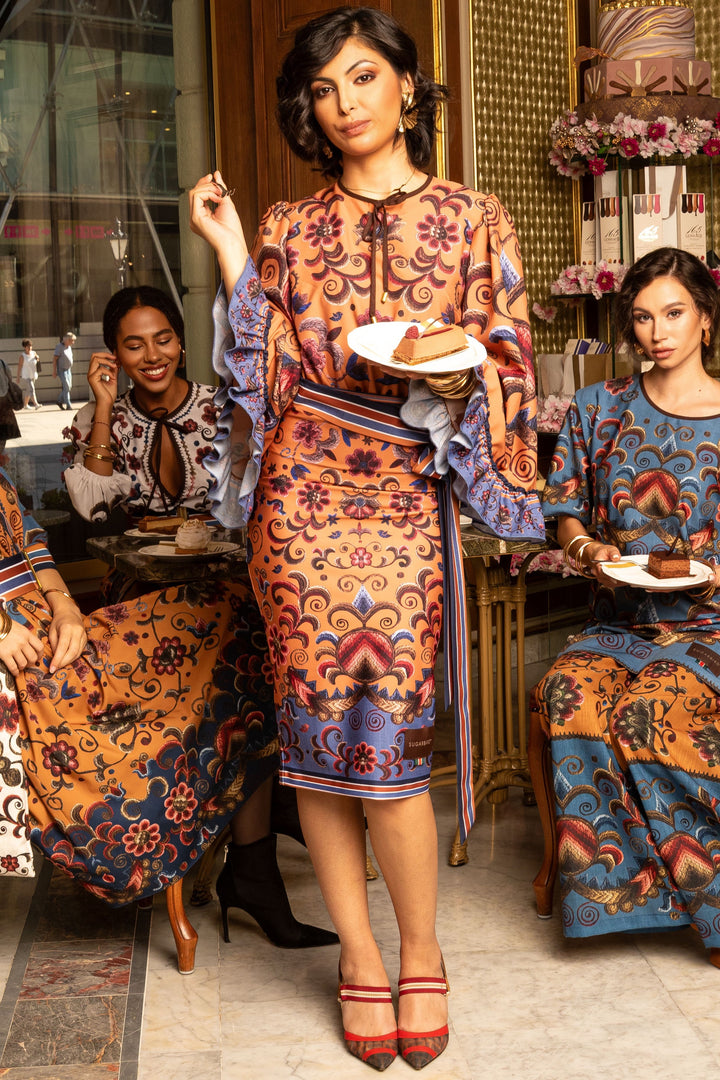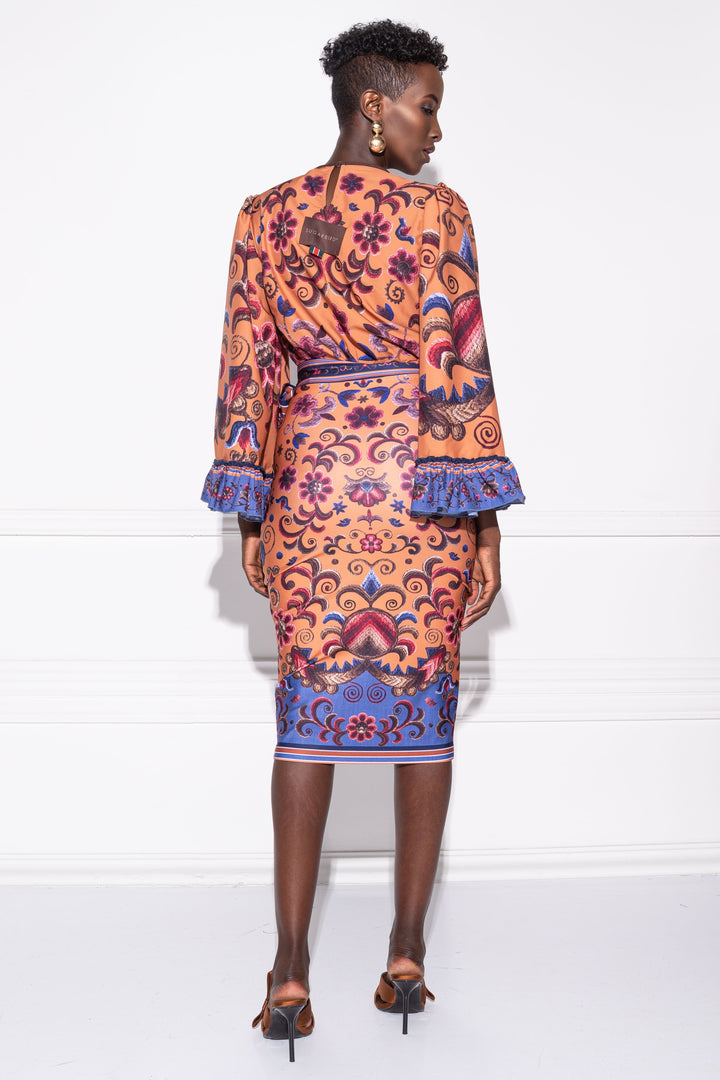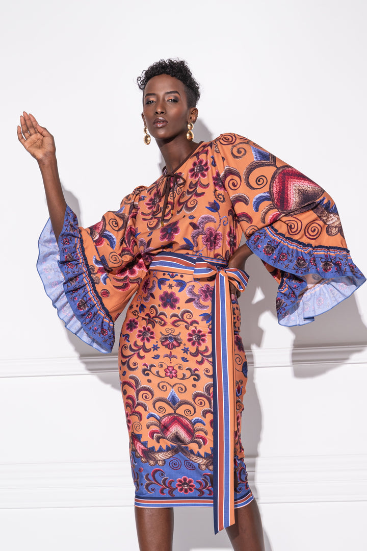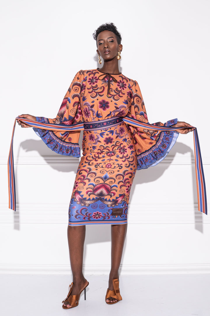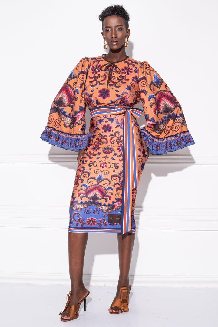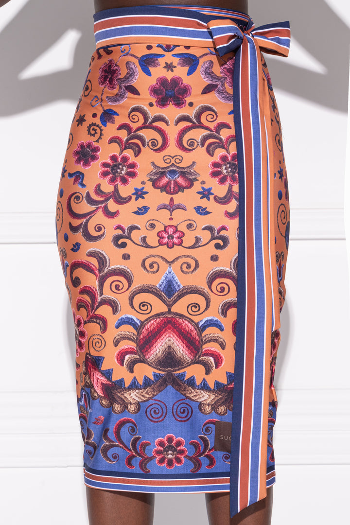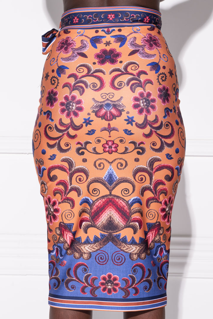 Below-the-knee length, form-fitting skirt. The waistband is fitted with a wide, long tie that can be tied into a bow if desired. It has a woven ribbon at the front.