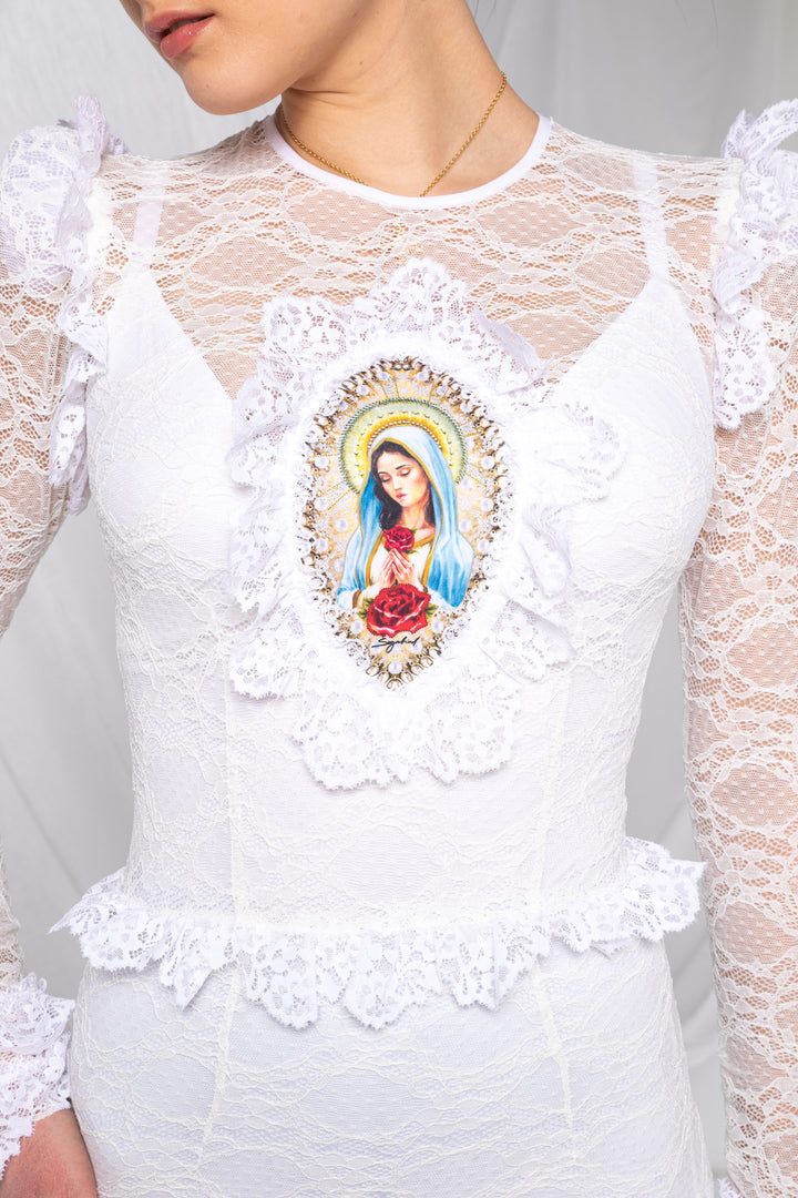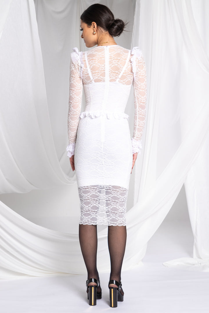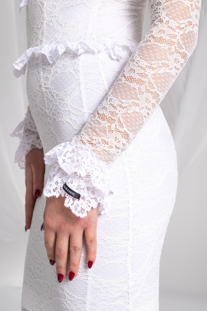 Below-the-knee, long-sleeved, form-fitting lace dress. The back has a zip closure, a closed and round neckline with a narrow strap. It is decorated with lace frills at the waist, at the bottom of the sleeves, on the shoulders and around the front patch. On the sleeves SUGARBIRD We sewed a label with the inscription. A separate, shoulder-strapped, mid-thigh-length petticoat was also made for the style.