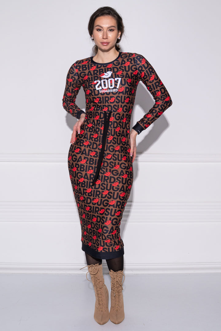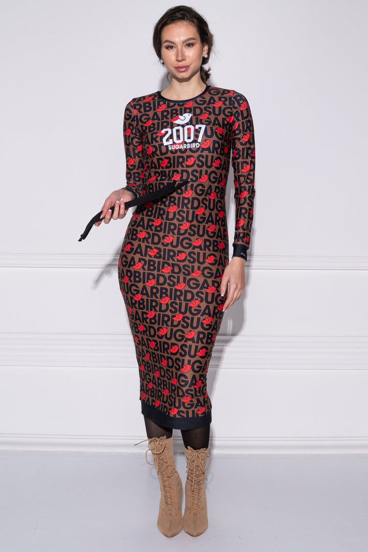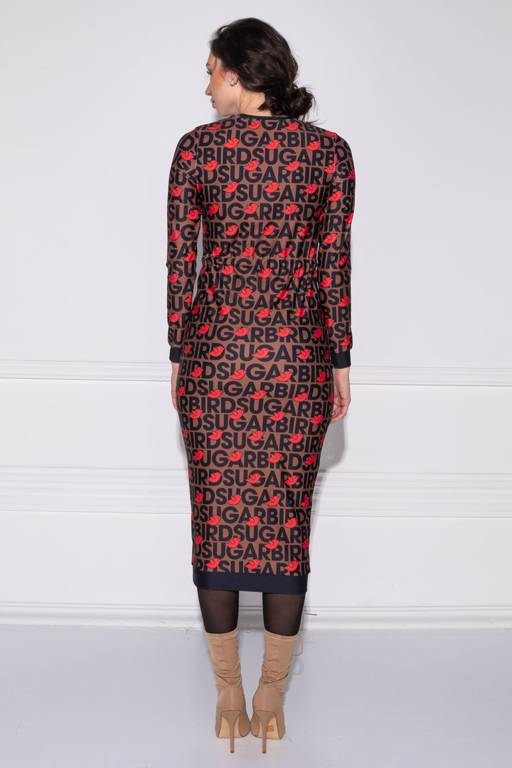 Long-sleeved, mid-calf-length, form-fitting dress. Closed round neck, hem and cuffs are hemmed with folded straps. Waist can be narrowed with a wide tie. The fit