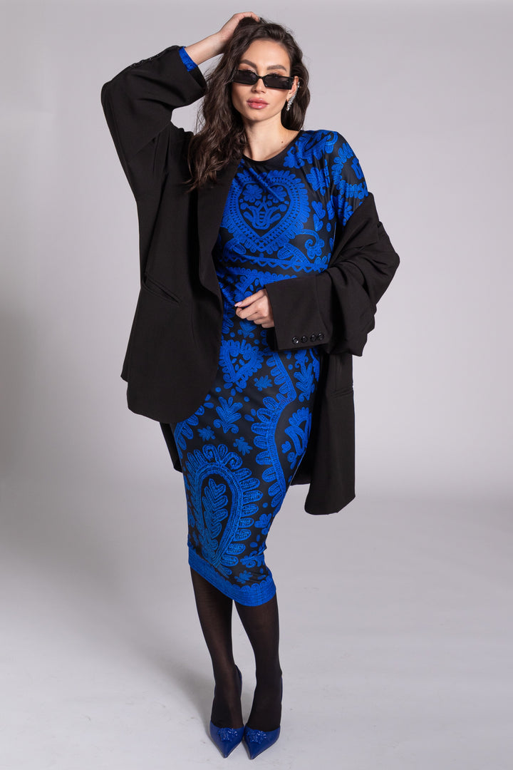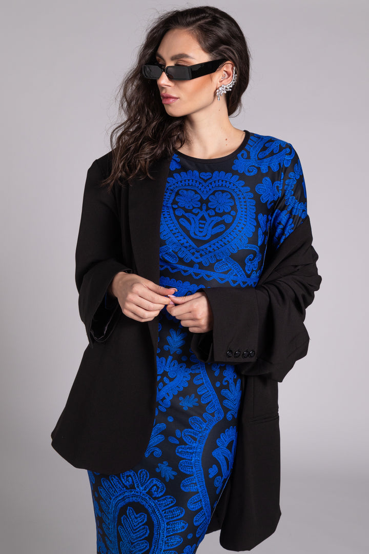 The pattern of our collection is decorated with graphics printed in blue on a black background, based on the Kalotaszeg written embroidery found in Transylvania.