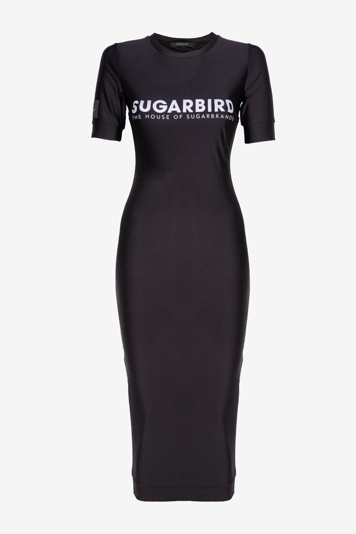 Short-sleeved, closed, round neckline, mid-calf length, form-fitting dress. Neck, bottom and bottom of sleeves are hemmed with folded straps. Small,