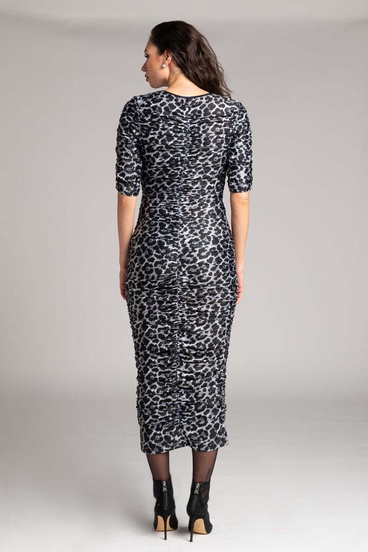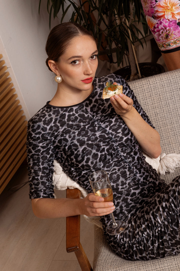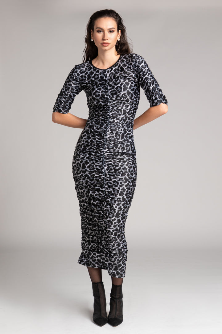 Mid-calf length, three-quarter sleeve, loose-fitting dress. Richly gathered on the sides and the front, back and sleeves. The round neckline is edged with a narrow strap, and on the back