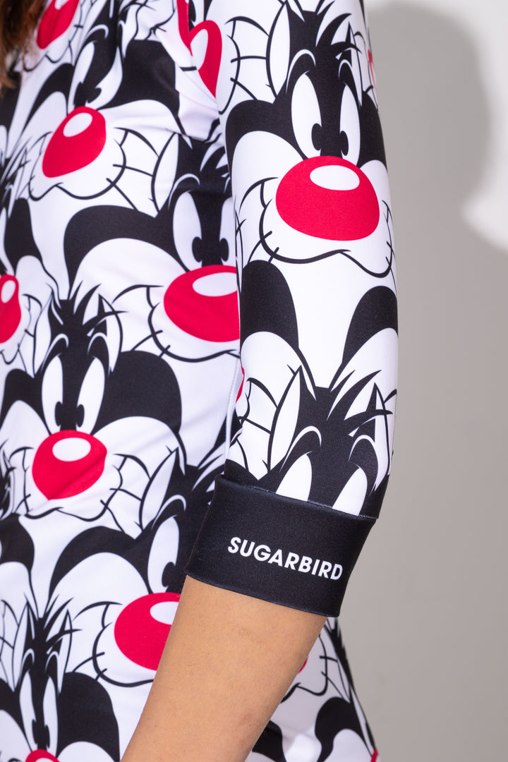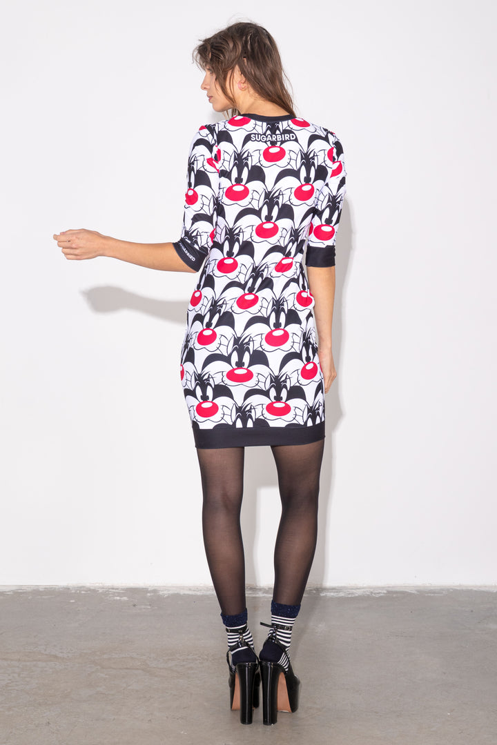 Three-quarter-length, mid-thigh-length, form-fitting dress. Closed round neck, hem and cuffs are hemmed with folded straps. On the side SUGARBIRD decorated with a label.
