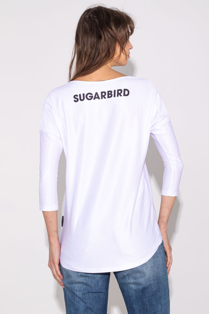 A loose-fitting top with three-quarter sleeves, below the hips, dropped shoulders, and a round neckline with a narrow strap. On the side