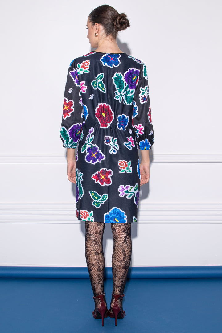 Mid-thigh length, long-sleeved, loose-fitting dress. The bottom of his sleeve and his back at waist height were rubberized. On his back SUGARBIRD We sewed a label with the inscription.