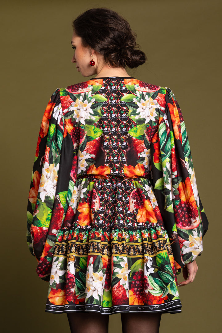 Mid-thigh length dress with extra wide and pulled sleeves, loose fit. Shoulders and skirt are pulled, bottom is ruffled. Bottom of sleeves are elasticated and richly gathered. It closes with a tie with a gold-colored fringed accessory above a slit in the middle of the front. On the back SUGARBIRD We sewed a label.