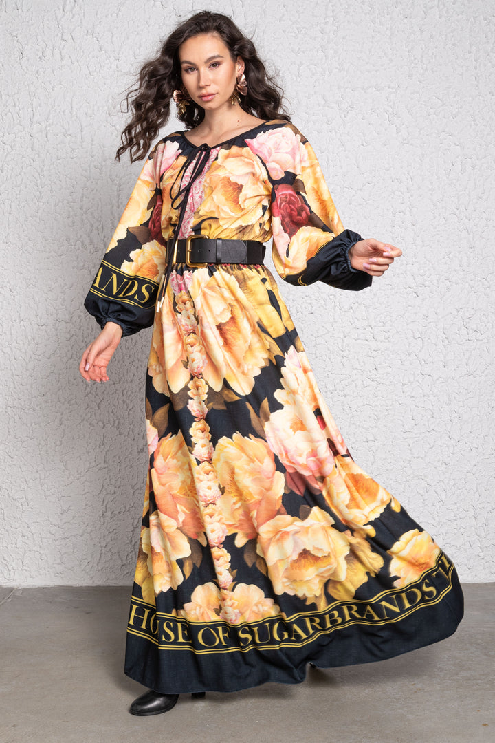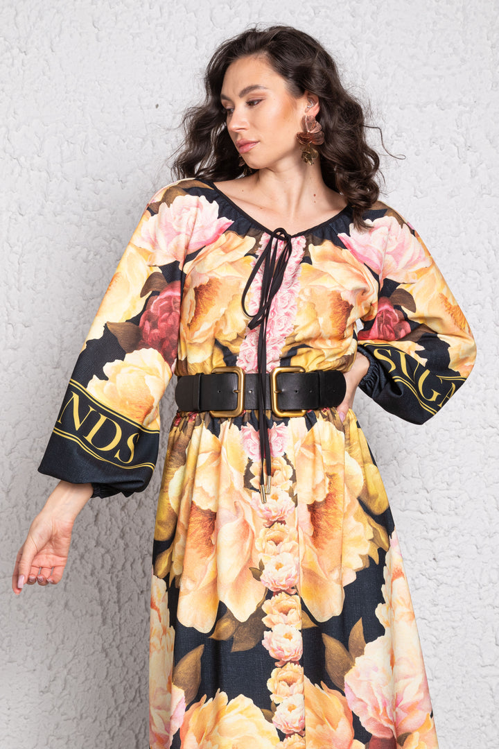 Long, loose-fitting maxi dress with wide raglan sleeves. Elasticated at the bottom of the sleeves and at the waist, the skirt is pulled. The round neckline and the cutout underneath are closed with a narrow tie. To the front SUGARBIRD We sewed a label with the inscription.