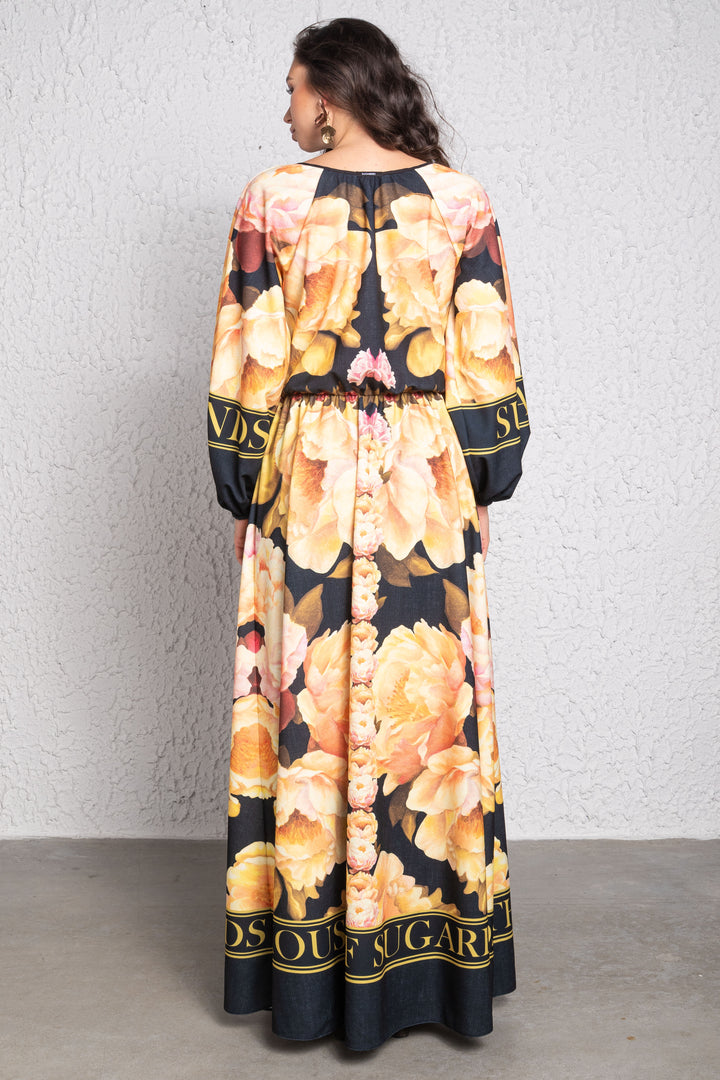 The romantic world of our collection is depicted in the painting “LA VIEN EN ROSE” flowers painted on a black background with watercolor technique and gold “THE HOUSE OF SUGARBRANDS” printed patterns make it elegant and special.