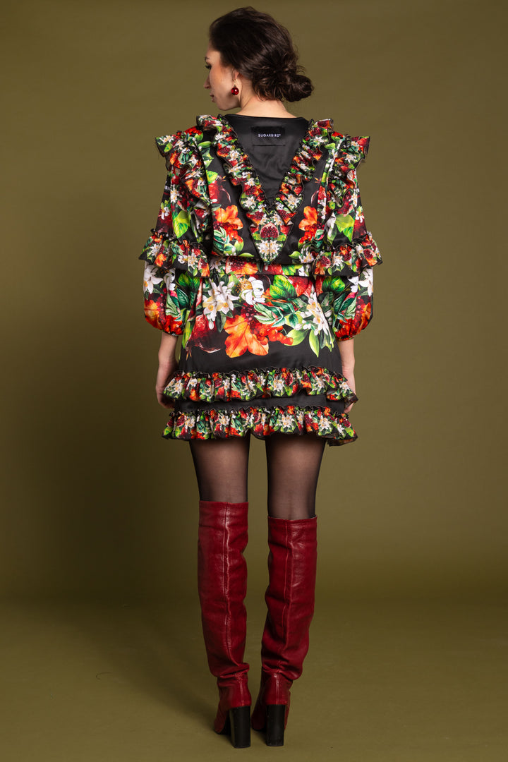 A loose-fitting dress with long, puffy sleeves that reach mid-thigh. The sleeves, shoulders and front are decorated with cut lines, and a ruffle at the bottom of the skirt. The bottom of the sleeves is elasticated, and the closed, round neck is edged with a narrow strap. On the back