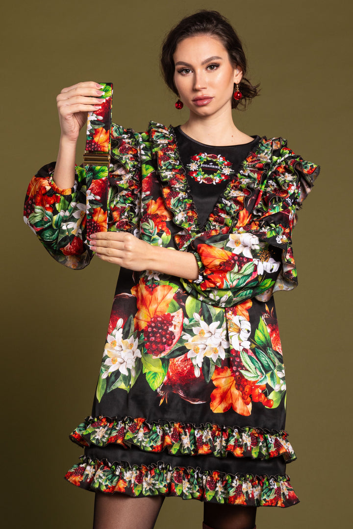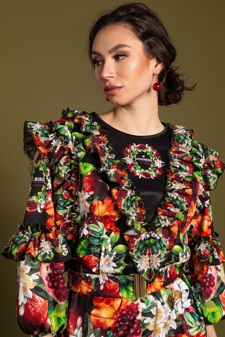 Choose from our favorite styles, now made special by pomegranate, flower and leaf motifs printed on a black background.