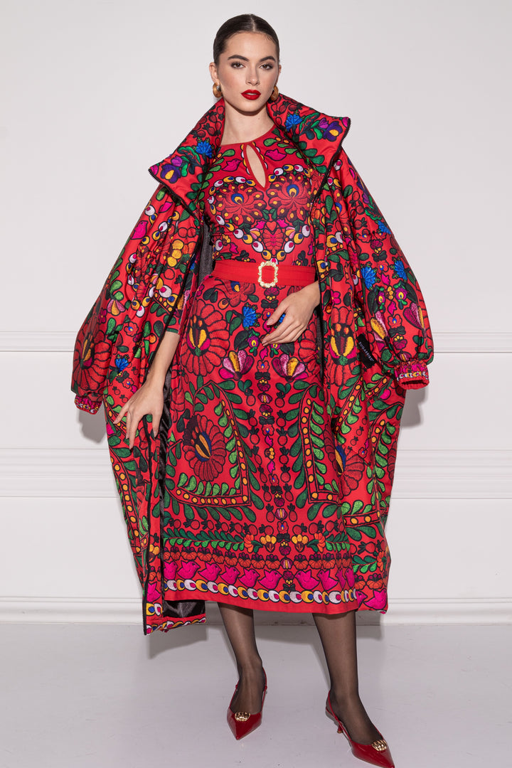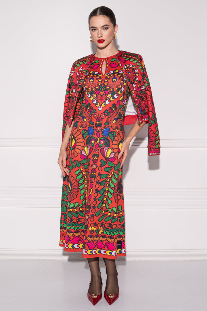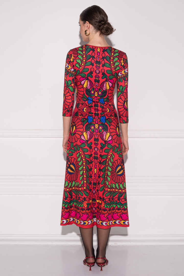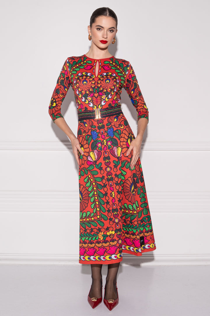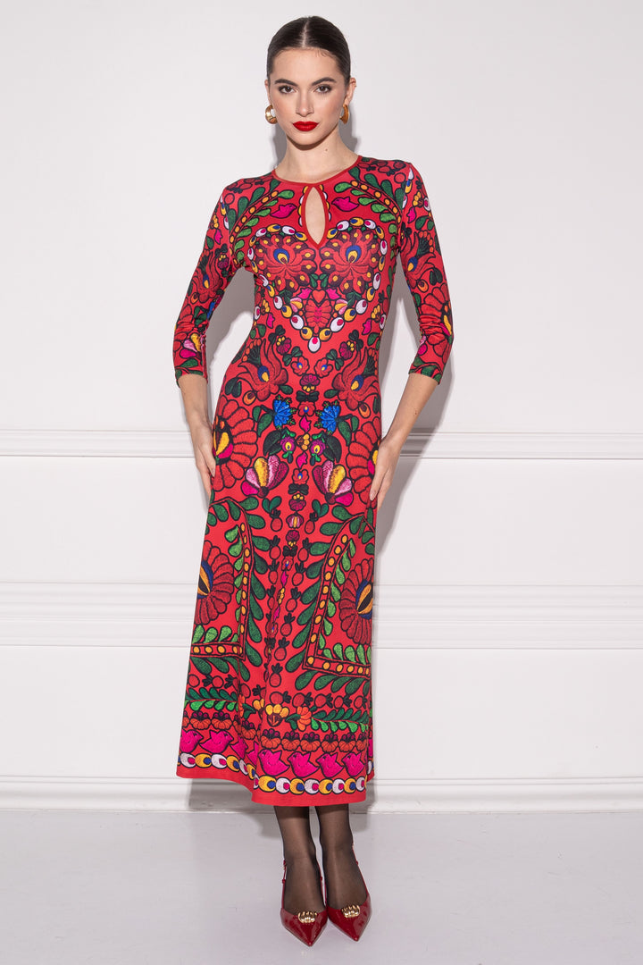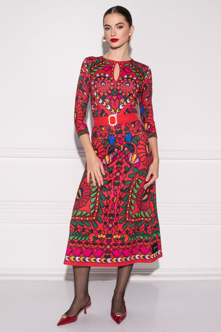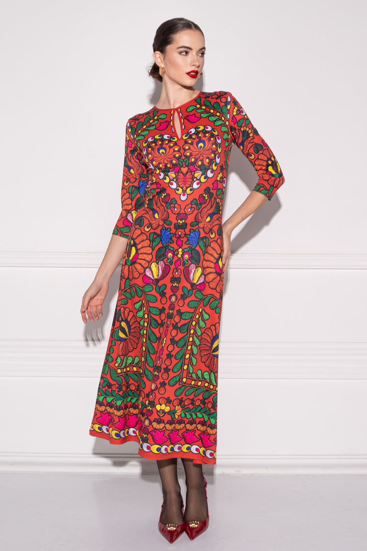 Three-quarter-length, mid-calf-length, form-fitting dress. Round neckline and slit in the middle of the front edged with a narrow strap. Skirt part is flared A-line. At the front SUGARBIRD It is decorated with a label with the inscription MATYÓ.