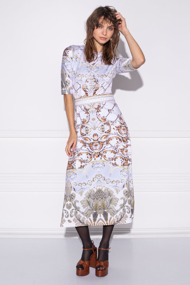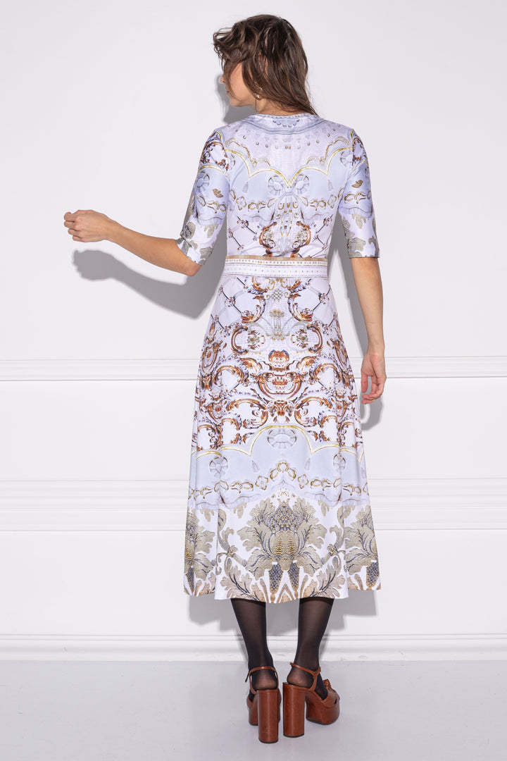Three-quarter-length, mid-calf-length, form-fitting dress with a closed round neckline and a folded-over strap. The skirt is flared in an A-line.